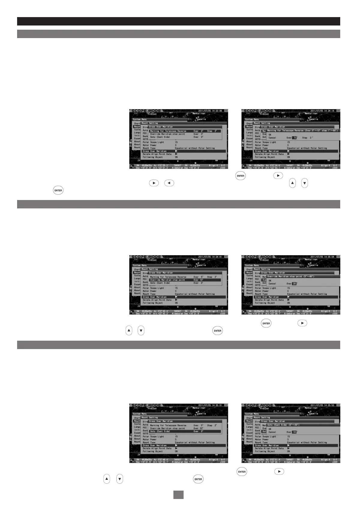 In the “Cross Over Meridian” dialog box, choose “Warning for Telescope Reverse” and press the key (or the key) to call up the dialog