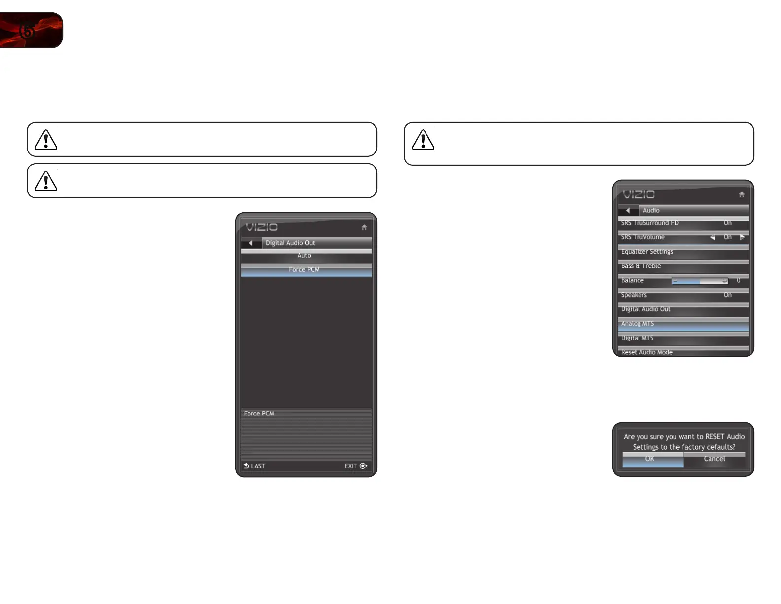 4. The TV displays “Are you sure you want to RESET Audio Settings to the