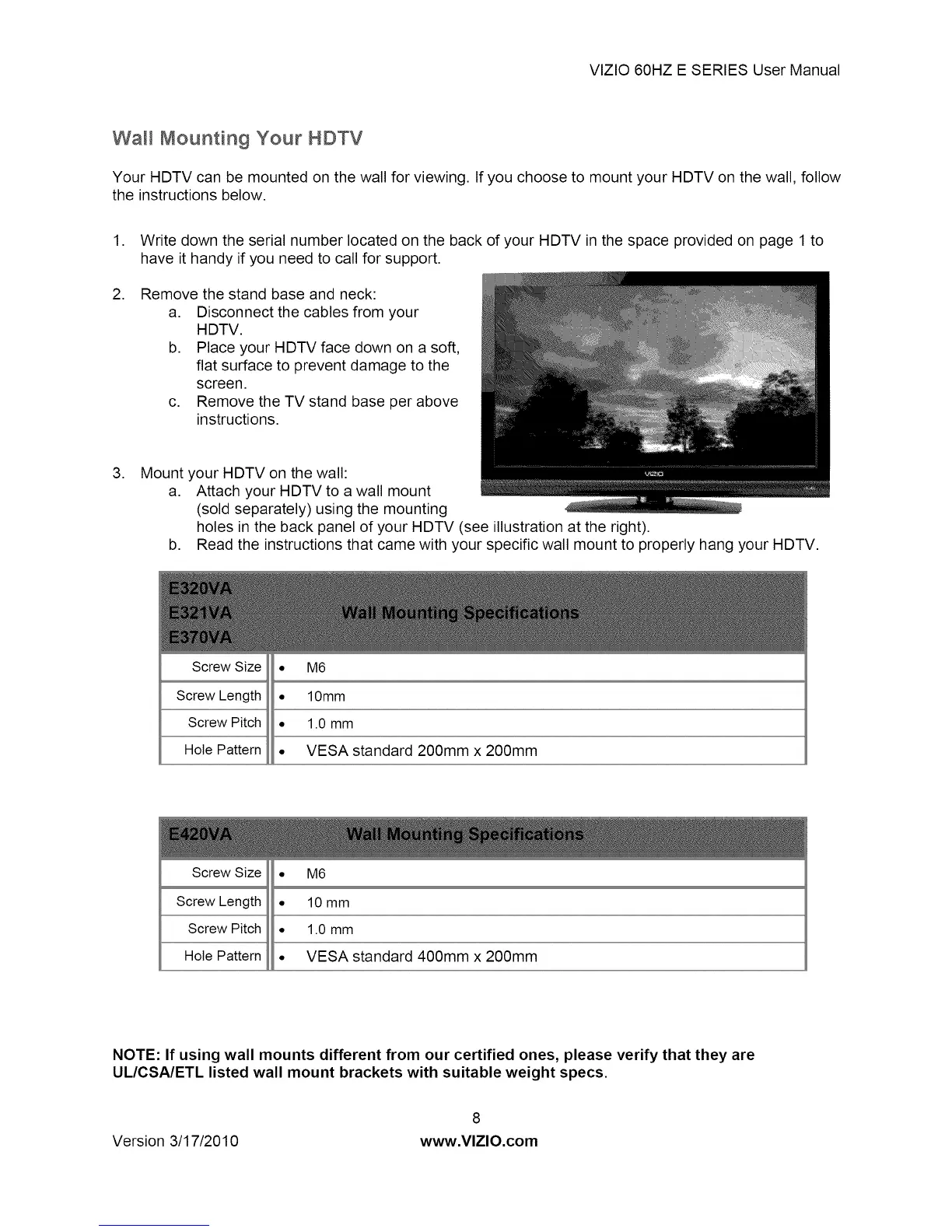 NOTE: If using wall mounts different from our certified ones, please verify that they are