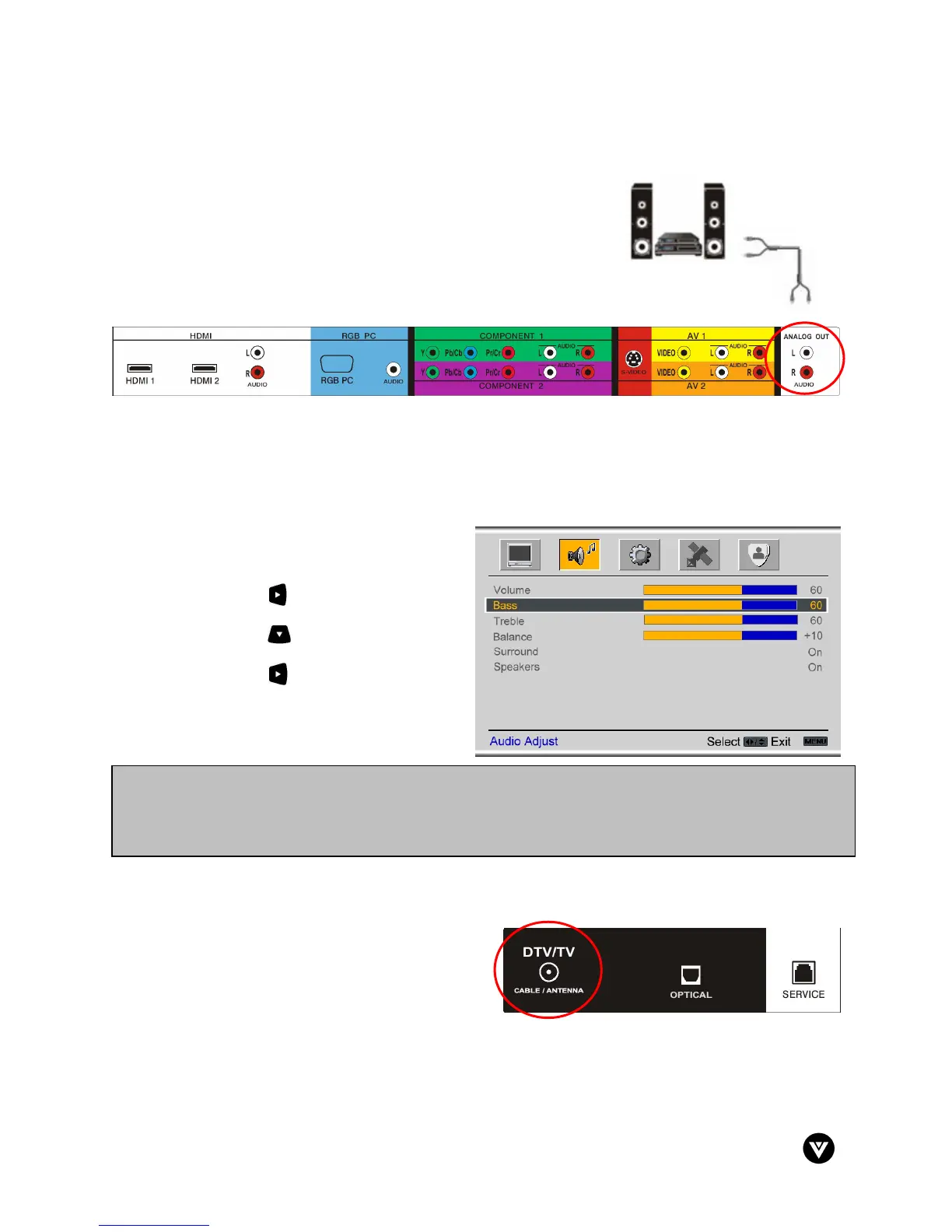 AUDIO OUT (black area) at the rear of the LCD HDTV.