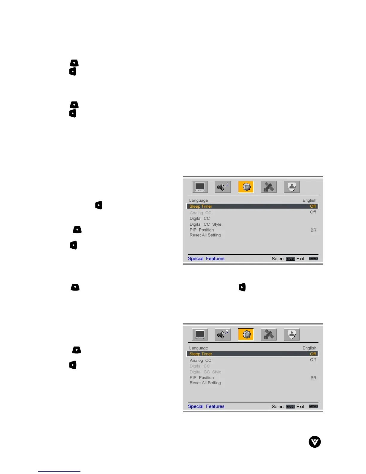 Press the button to highlight the Sleep Timer selection. Press the button to select the timer to