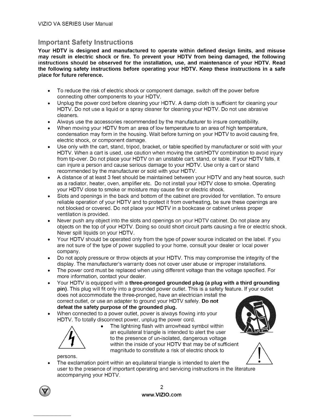 the following safety instructions before operating your HDTV. Keep these instructions in a safe