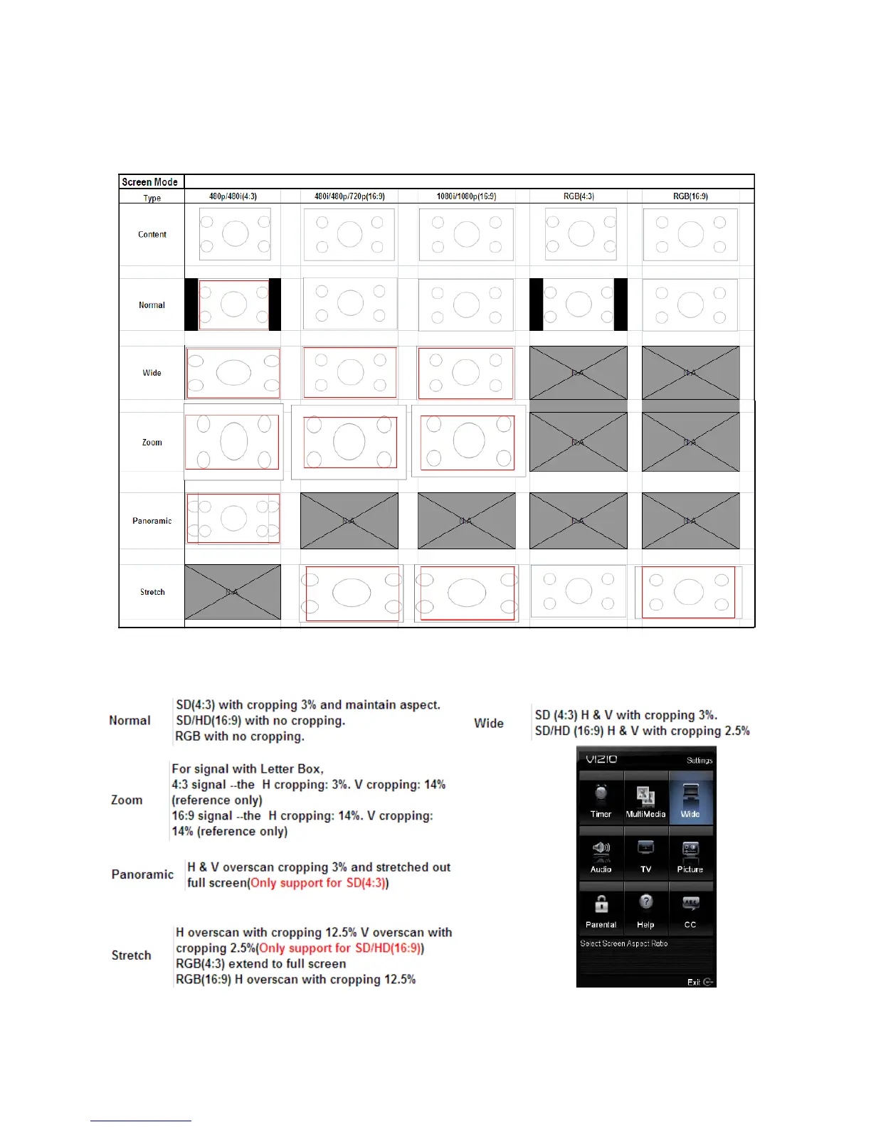 The following table shows the different screen modes and display sizes according to the content being