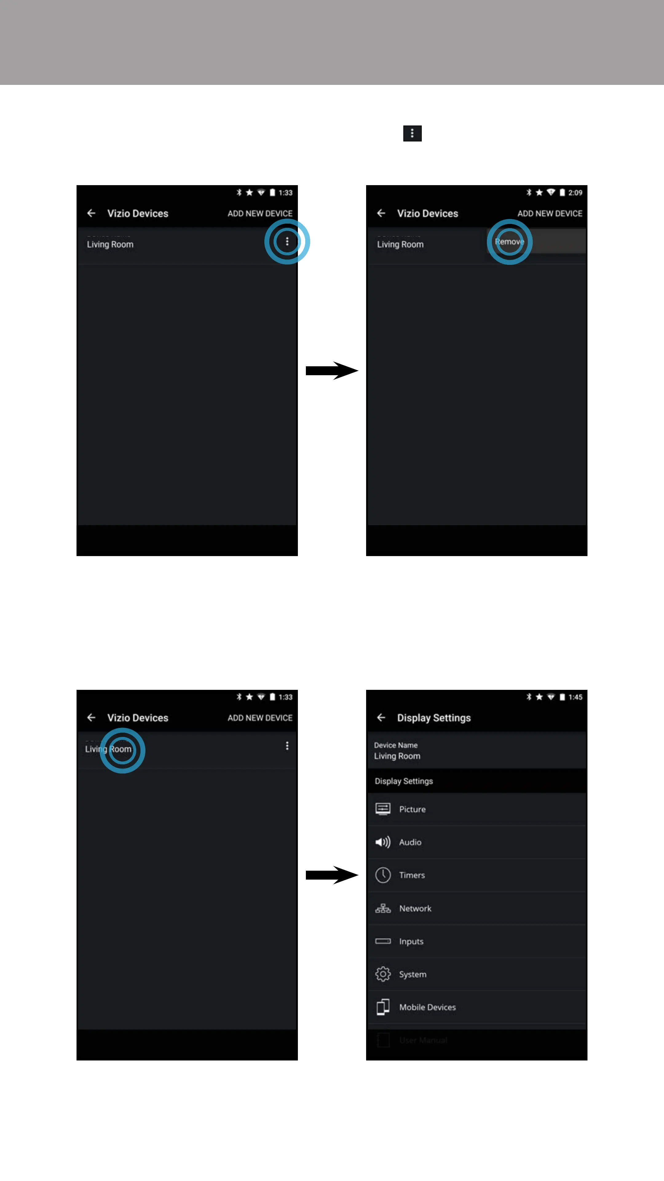 • From the VIZIO Devices menu, tap on the button and tap Remove to