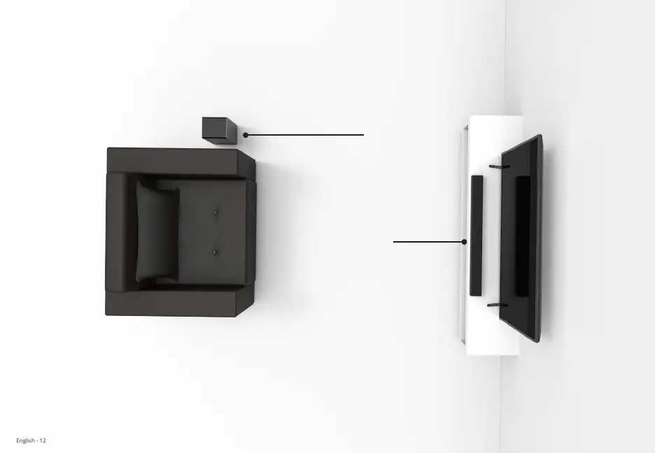 The Sound Bar should be close to ear level. The Subwoofer should be placed in a