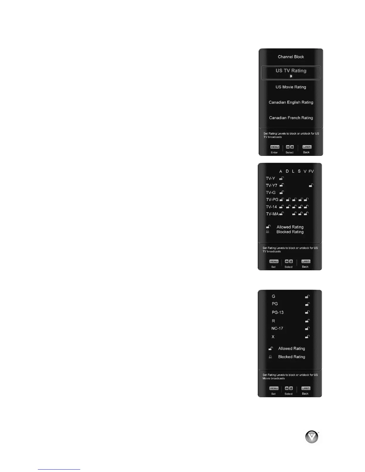 ! or " button to navigate through the TV rating options.