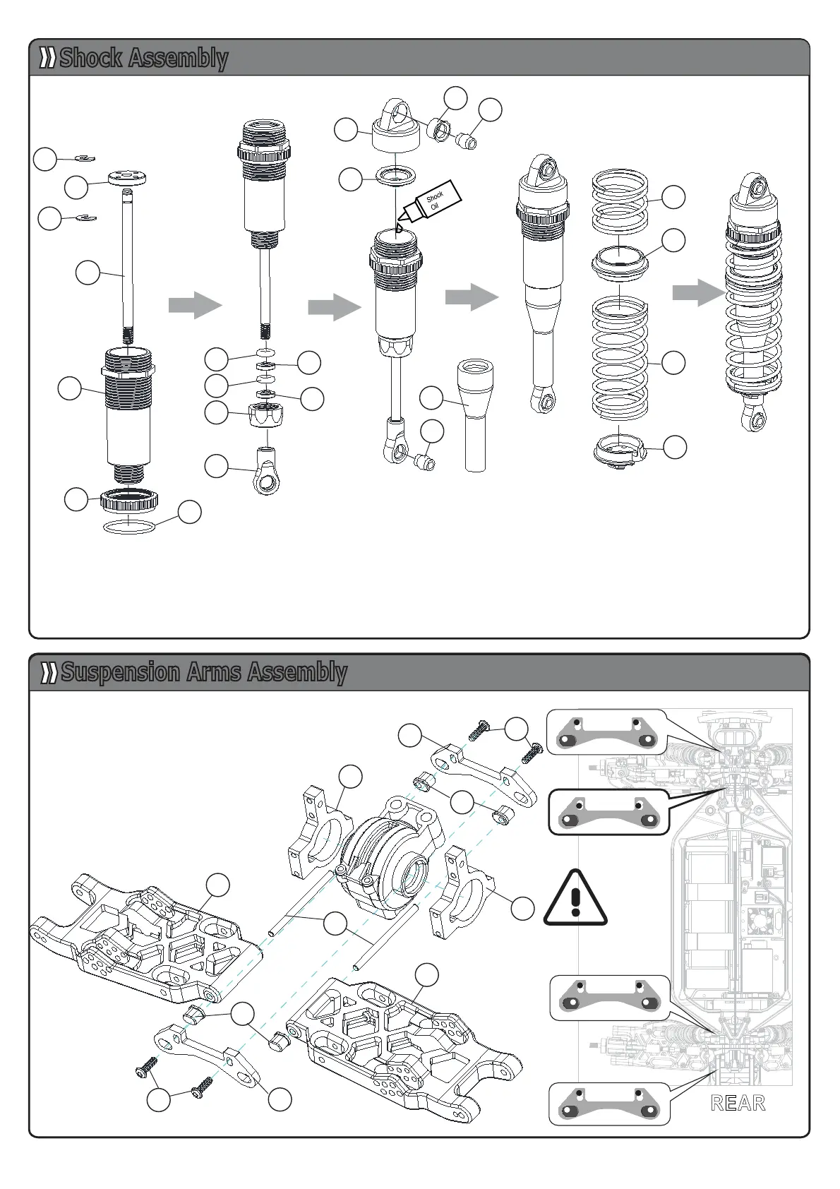 1.Fill shock body with 4/5 silicone fluid(purchase seperately),pump the shock shaft
