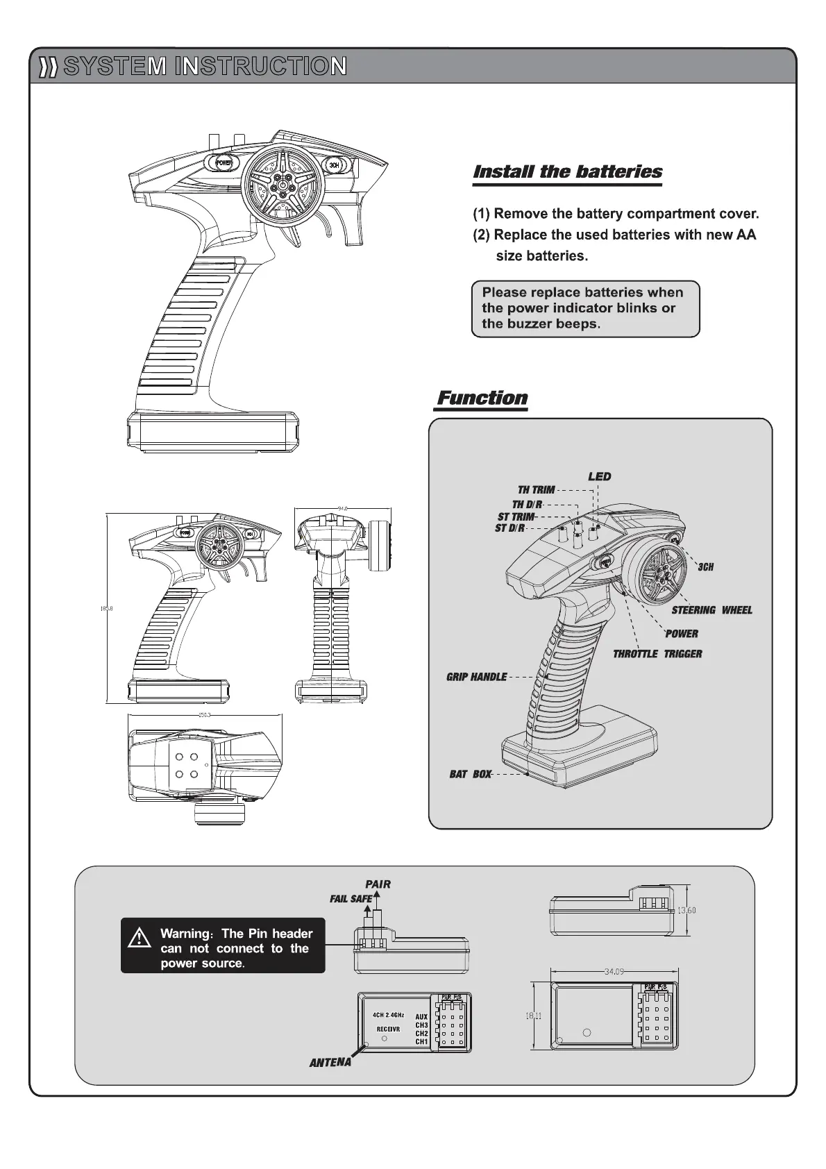 VKAR Bison - System and Transmitter Instructions; Transmitter Battery Installation; Transmitter Functions Overview; Receiver Power Connection Warning