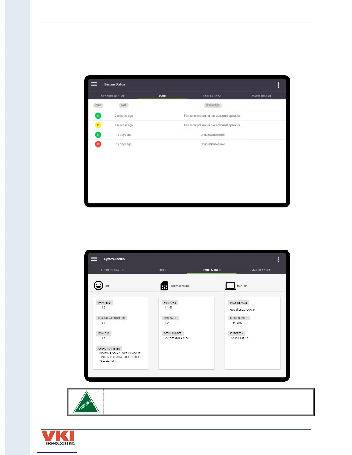 The 'Logs' tab shows the fault history of the equipment in list form (from newest to oldest).