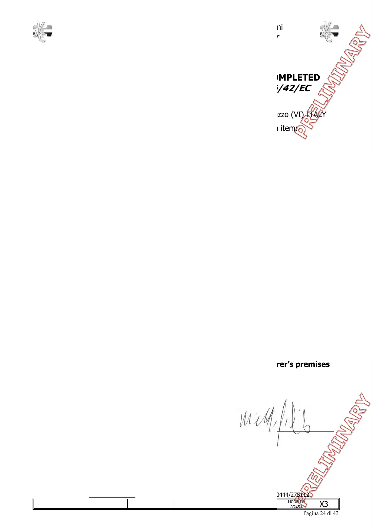 With the present VMC S.p.A. headquartered in Via Palazzon, 35 Creazzo (VI) ITALY