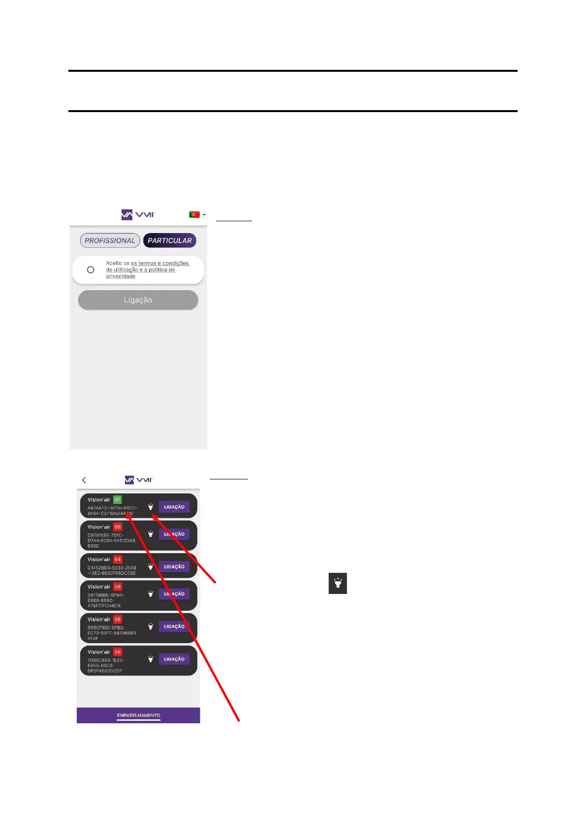 botão EMPARELHAMENTO da aplicação VMI+ e a VMI a