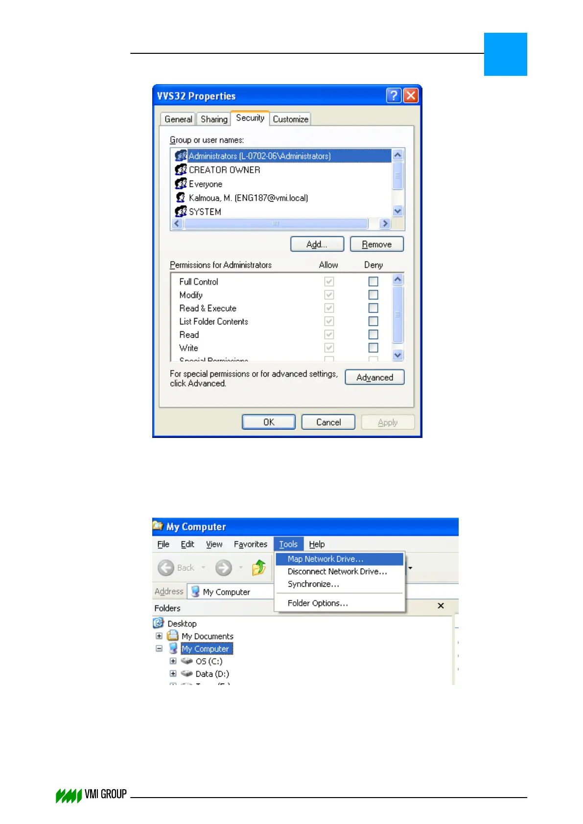 Select the SECURITY tab and the account which is used by the VVSU client.