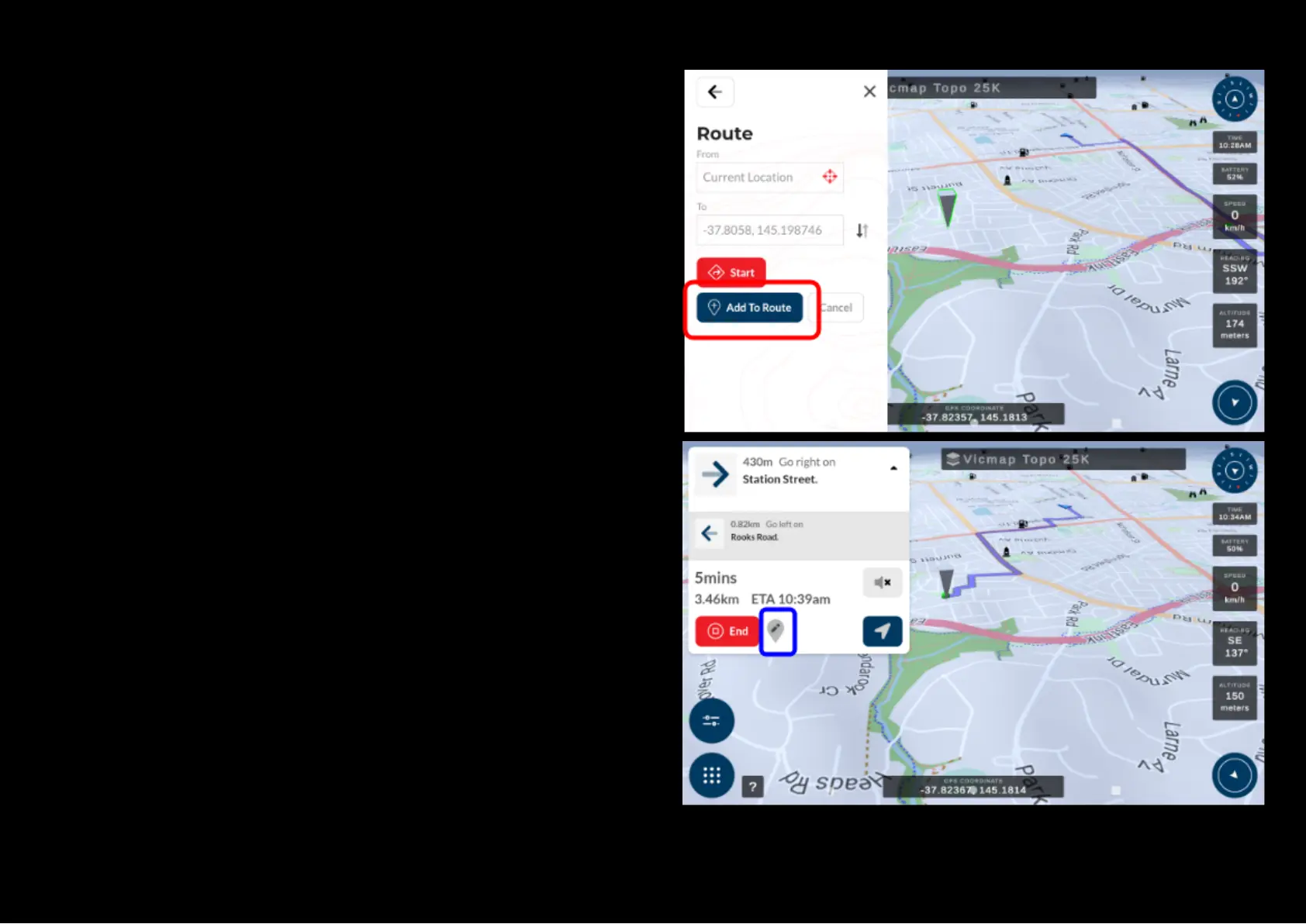 ‘Route’ button. Then select the blue ‘Add to Route’ button. The unit will