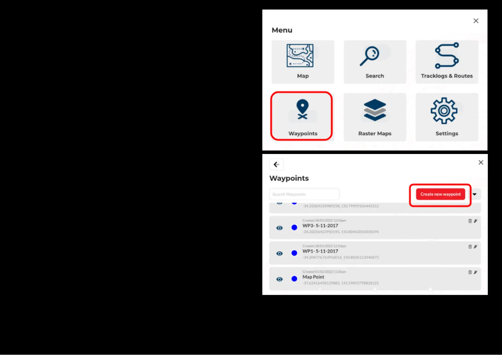 To add a waypoint by coordinates, press the Waypoints button from the
