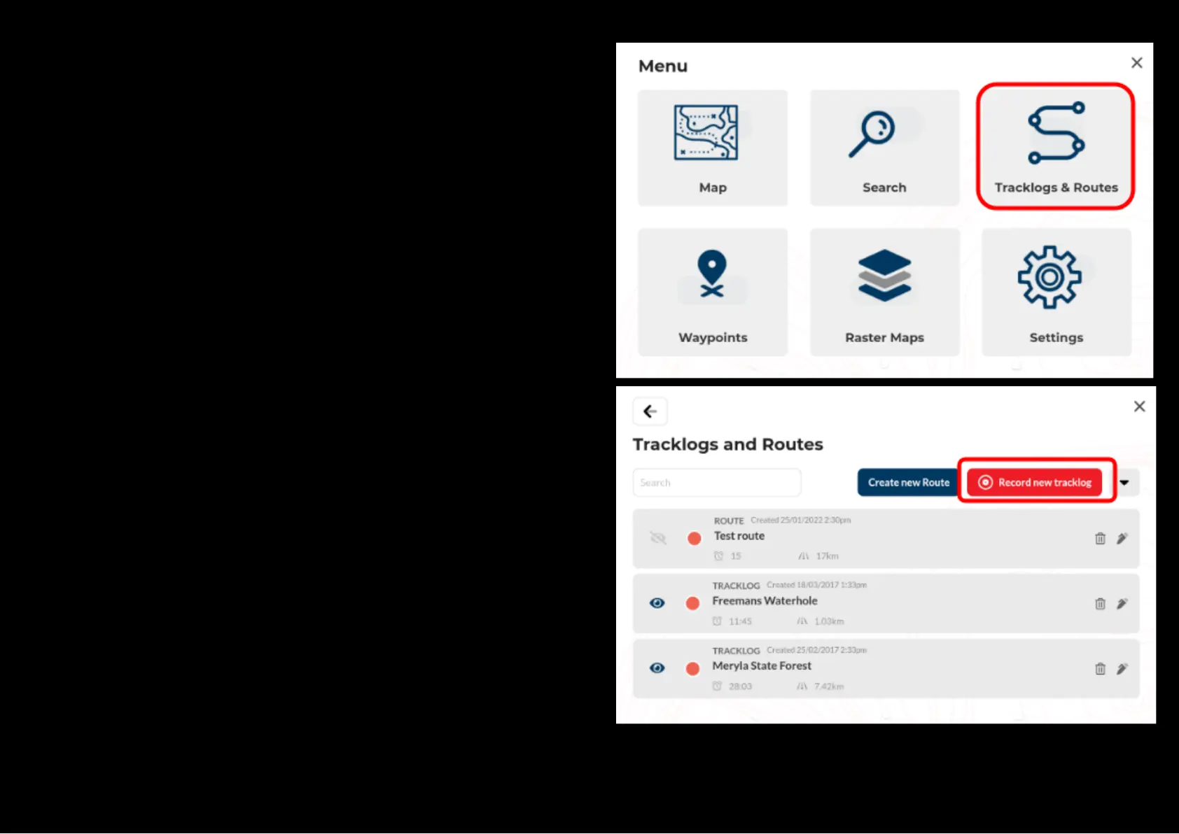 All the tracklogs features can be accessed via the main menu by selecting