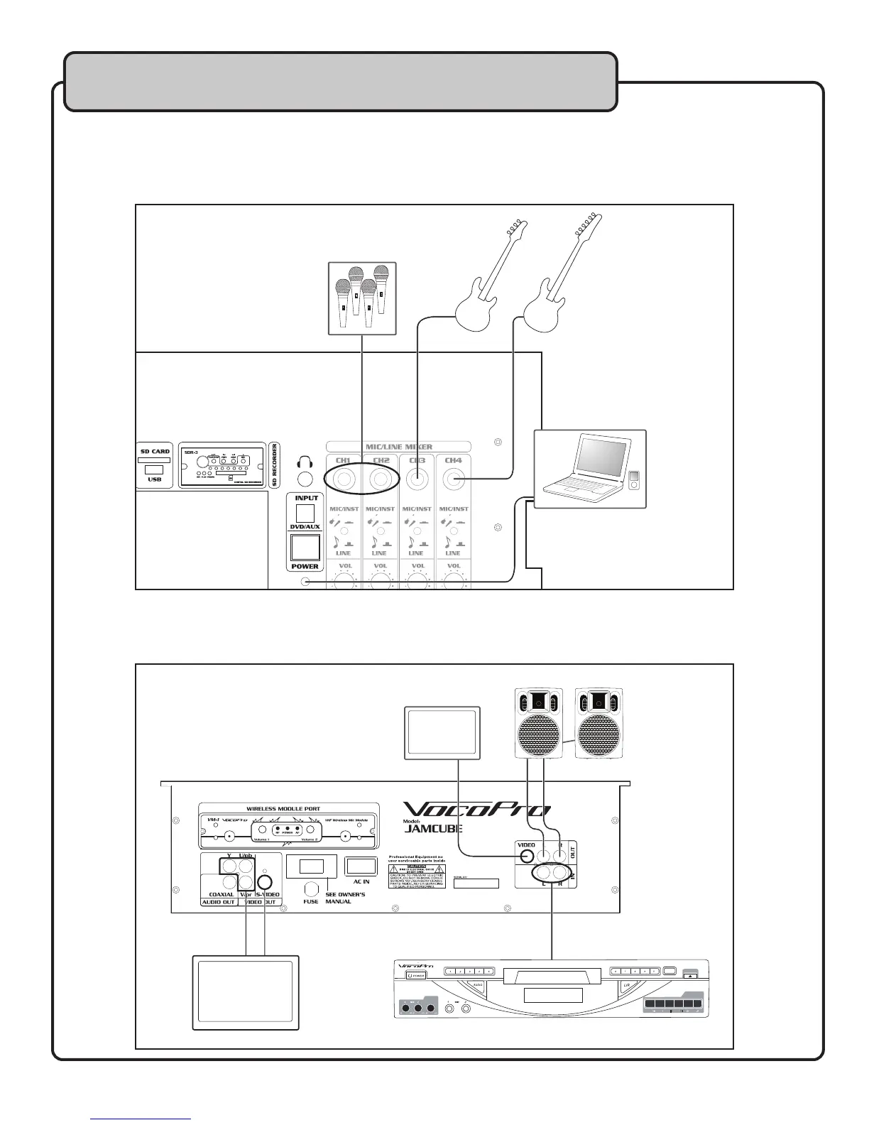 Connect your microphones, instruments, and portable media devices as shown.