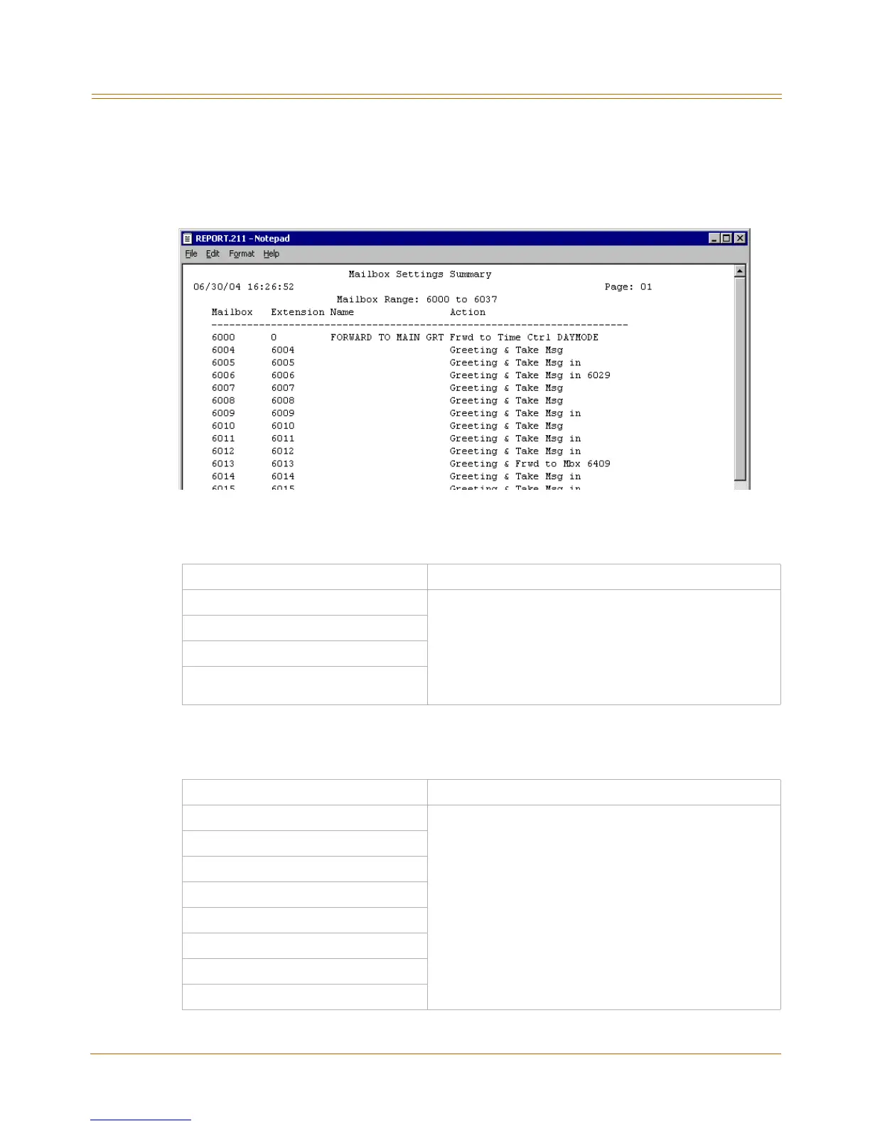 Settings reports identify various voice mail system settings that were entered during