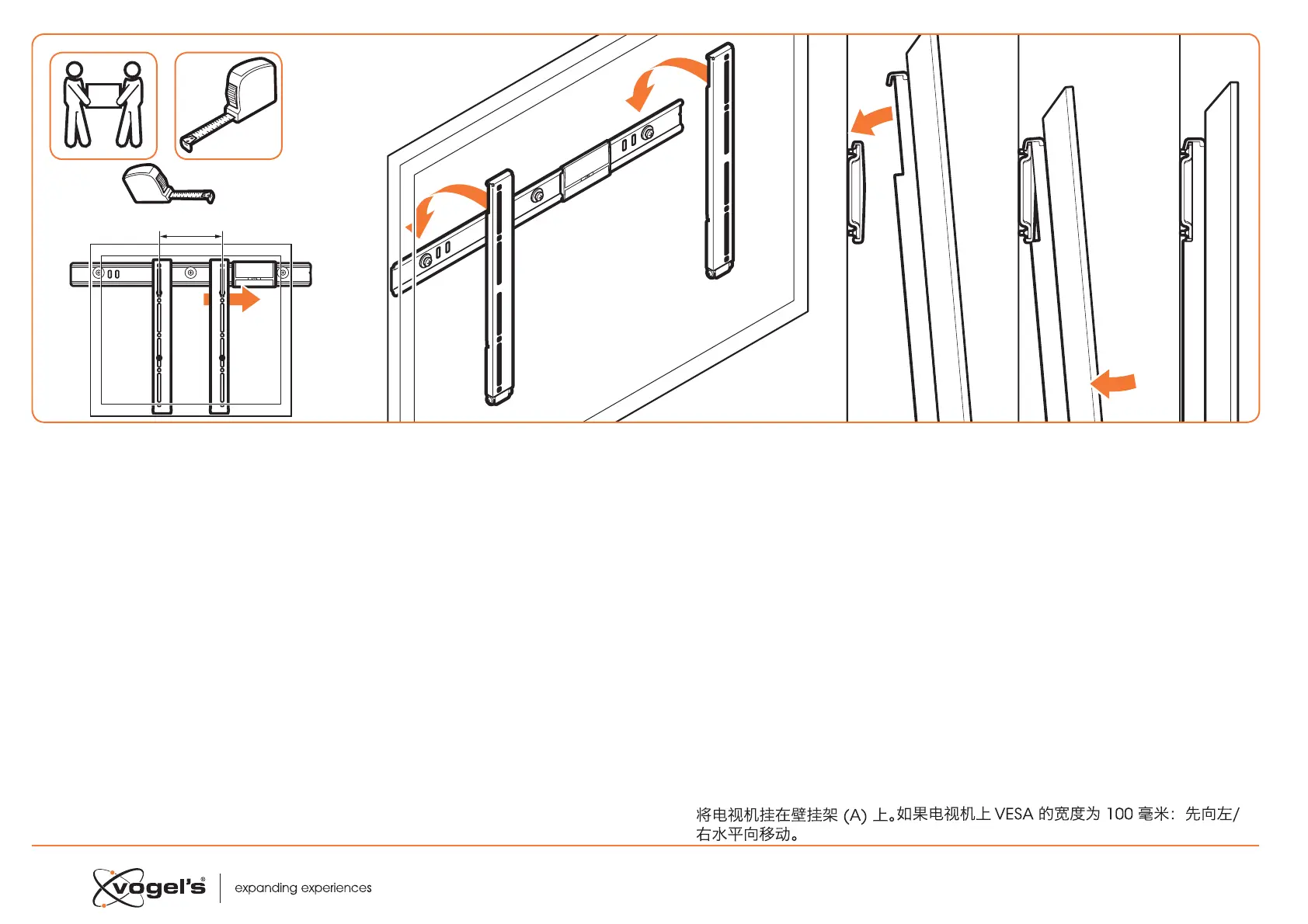 If the VESA width of the TV is 100 mm: first move the level to the left/right.
