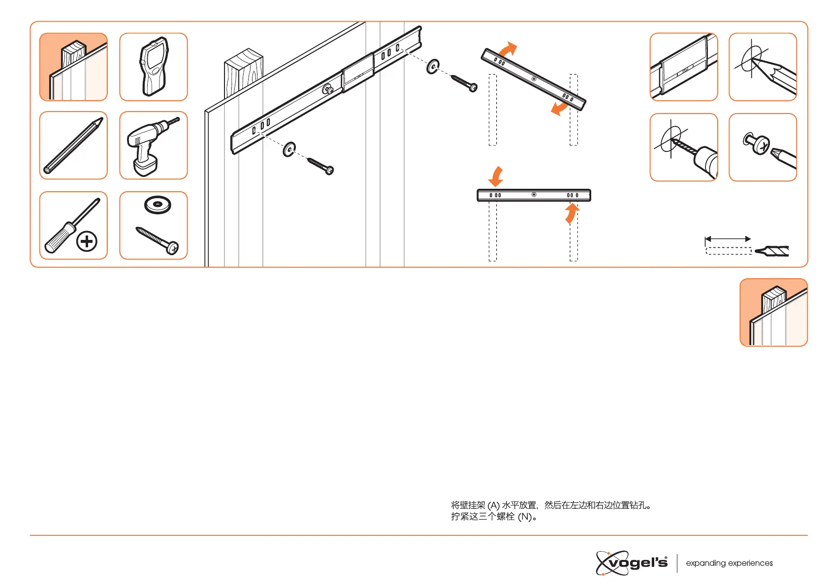 FR - Positionnez le support mural (A) de niveau et forez le trou gauche et droite.