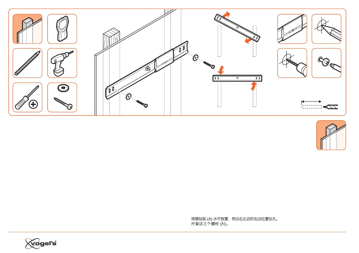 PL - Wypoziomuj uchwyt ścienny (A) i wywierć otwory z prawej i lewej rony.