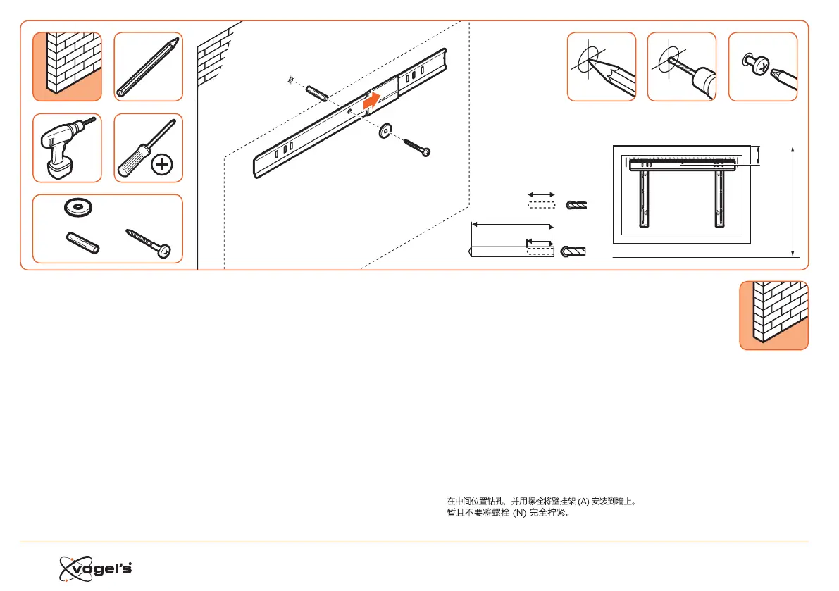 NL - Boor het gat voor de middele montageopening en schroef de wandeun (A)