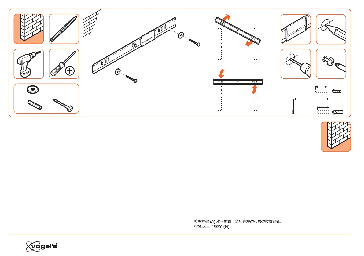 PL - Wypoziomuj uchwyt ścienny (A) i wywierć otwory z prawej i lewej rony.