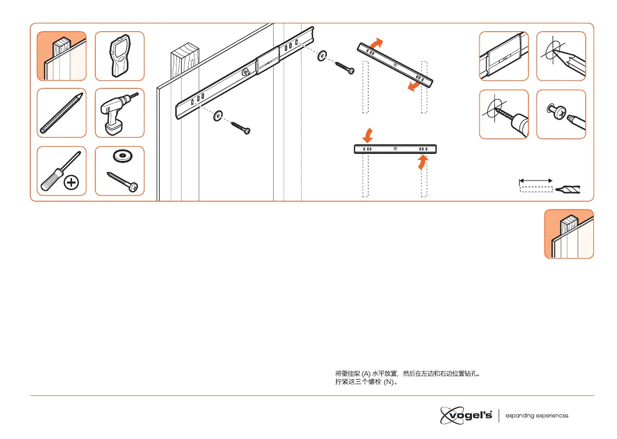 FR - Positionnez le support mural (A) de niveau et forez le trou gauche et droite.