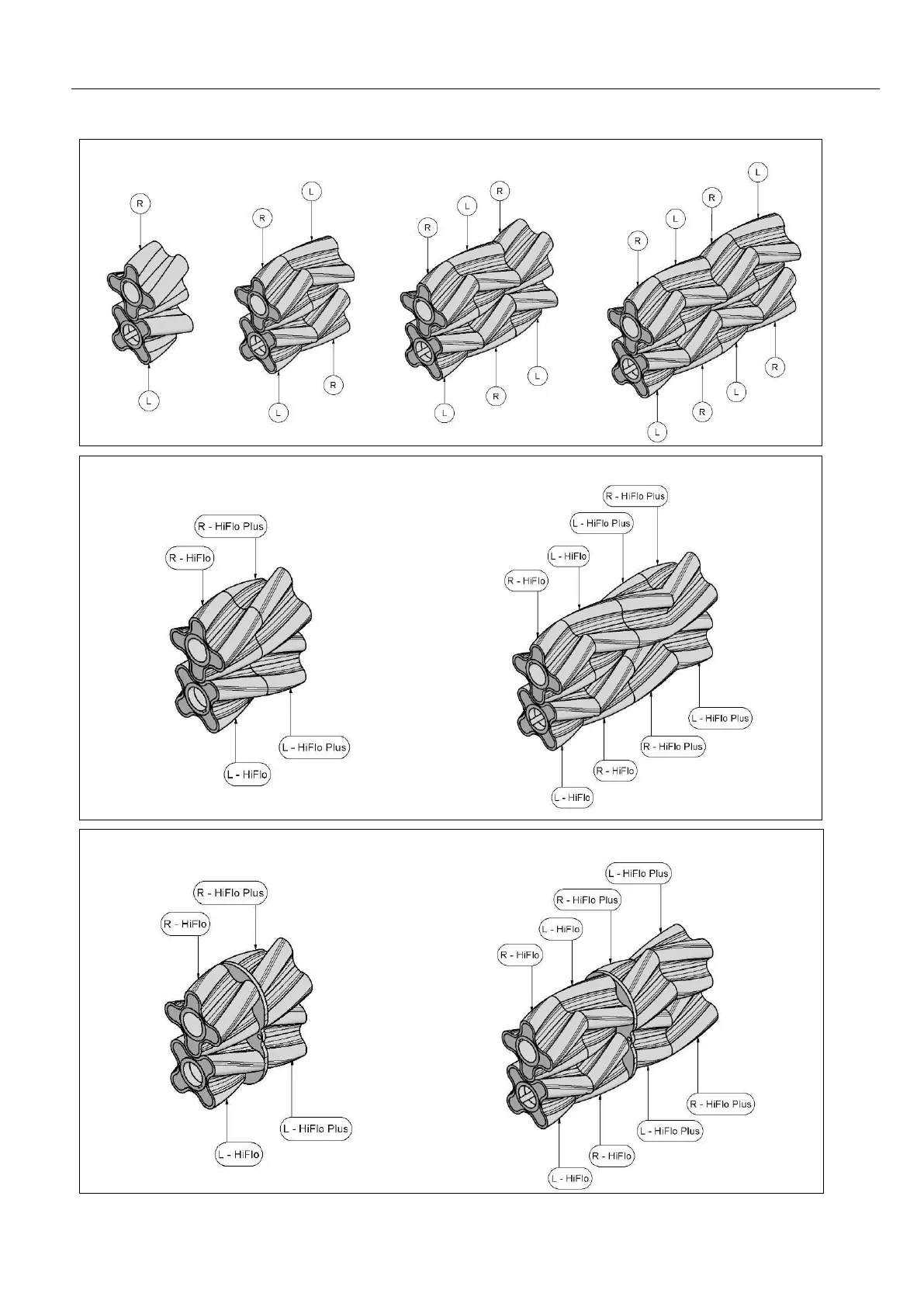 : Arrangement, HiFlo and HiFloplus (L = left rotary lobe, R = rotary lobe)