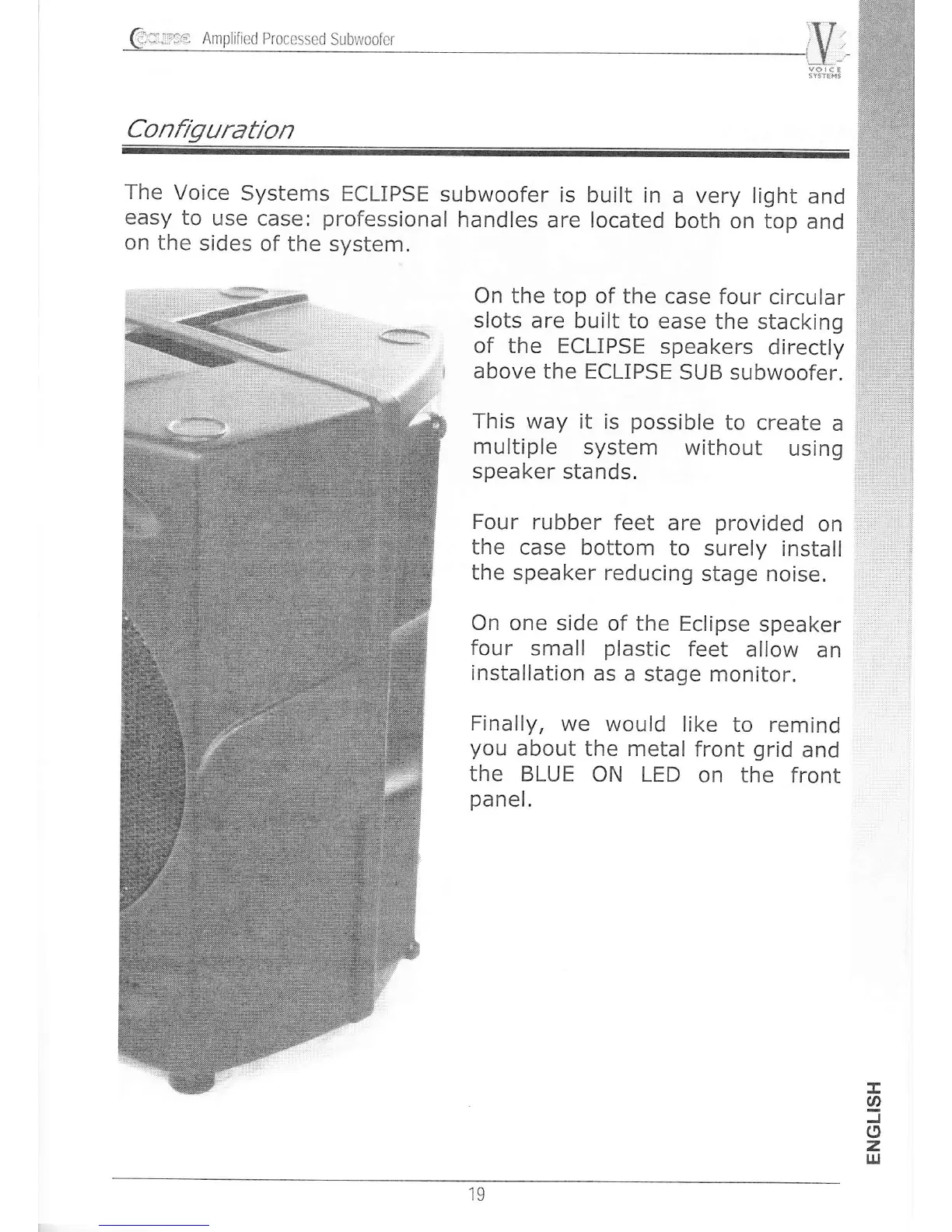Voice Systems eclipse sub - Configuration; Stacking Features; Base and Side Feet; Front Panel Elements