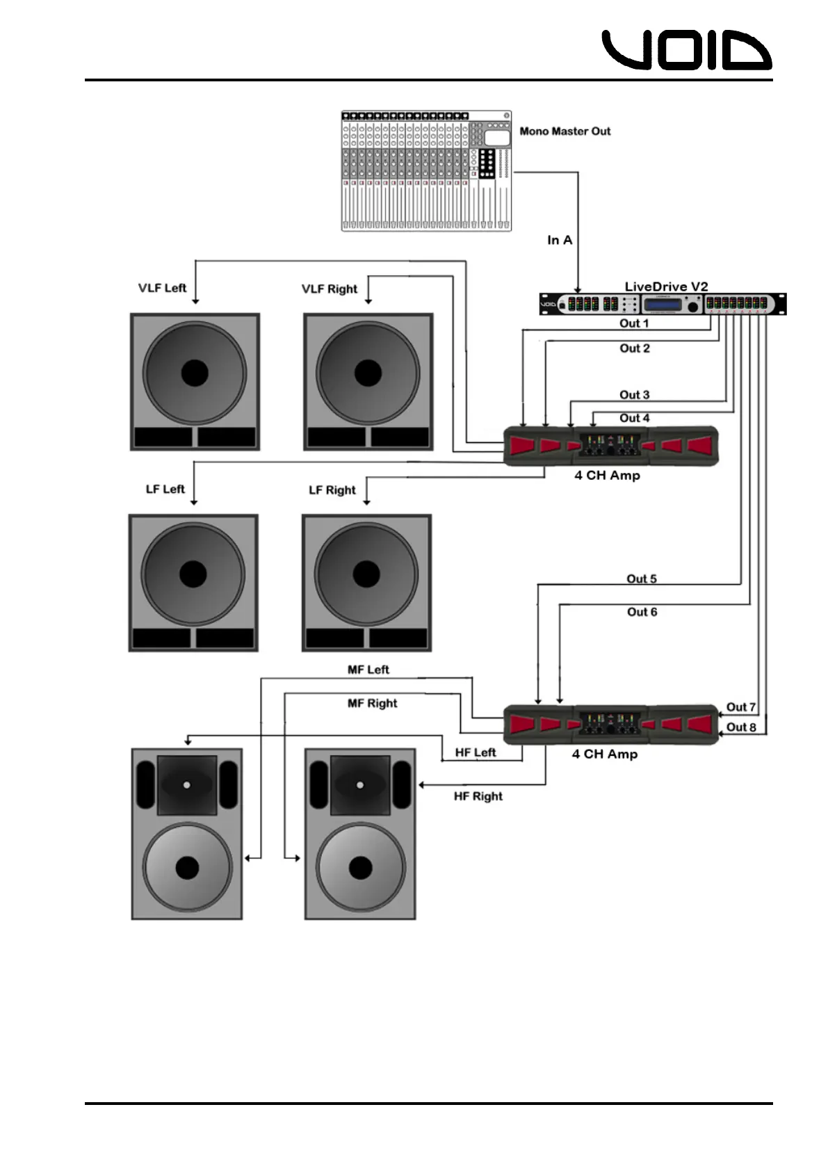 Stereo 4-way configuration using 4 power amplifiers for Very Low Frequencies, Low