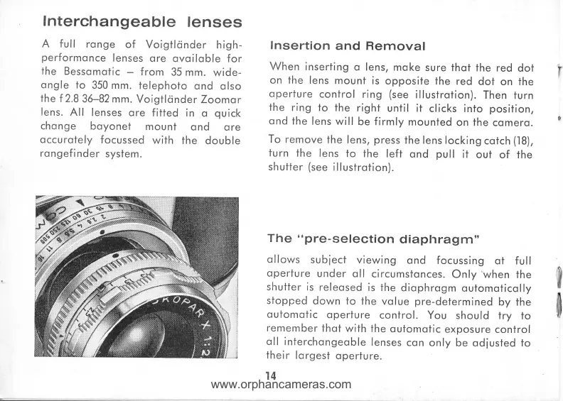 VOIGTLANDER BESSAMATIC - Interchangeable Lenses; Lens Insertion and Removal; The Pre-selection Diaphragm