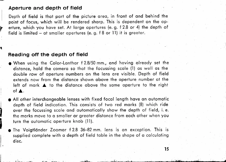 VOIGTLANDER BESSAMATIC - Aperture and Depth of Field; Reading Off Depth of Field