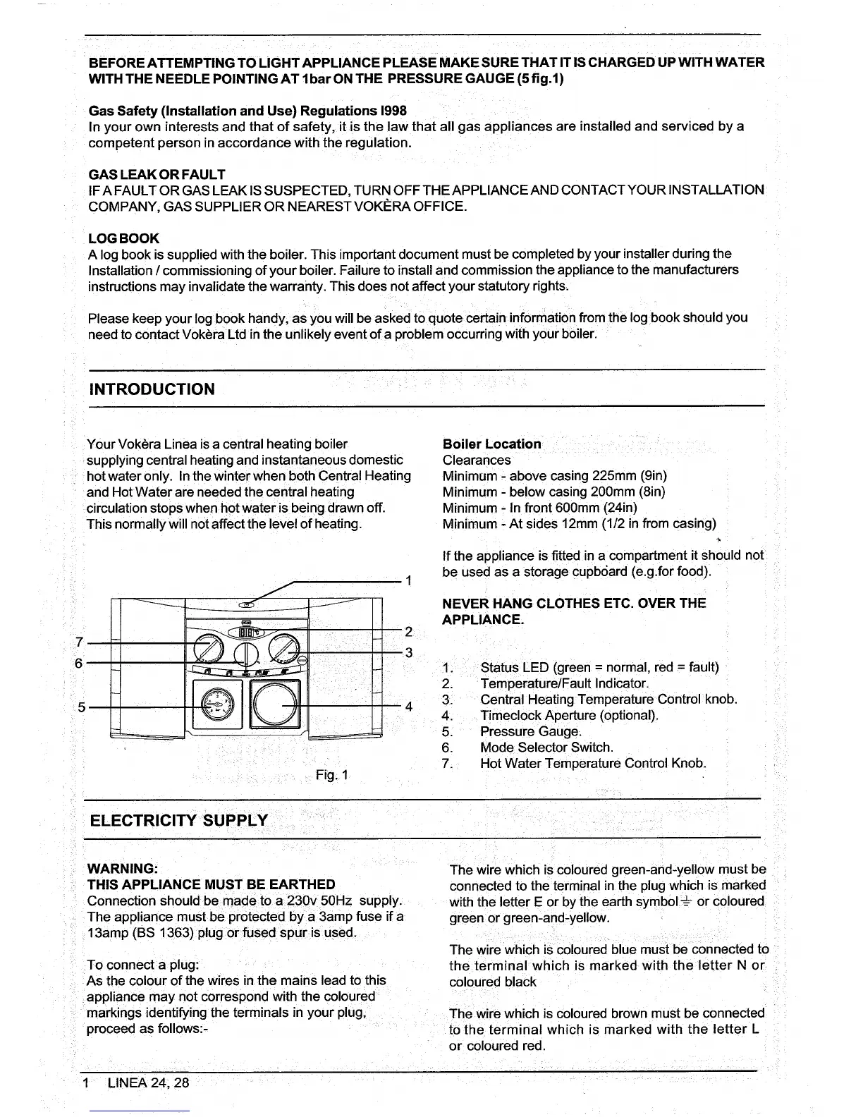 VOKERA Linea 24 - Introduction and Setup; Introduction; Electricity Supply; Boiler Location Clearances