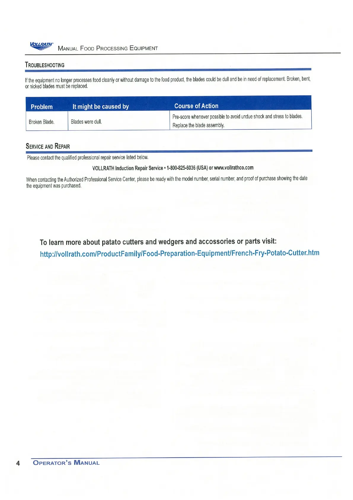 Vollrath 47713 - Troubleshooting and Service Information; Troubleshooting Common Problems; Professional Repair Service Information