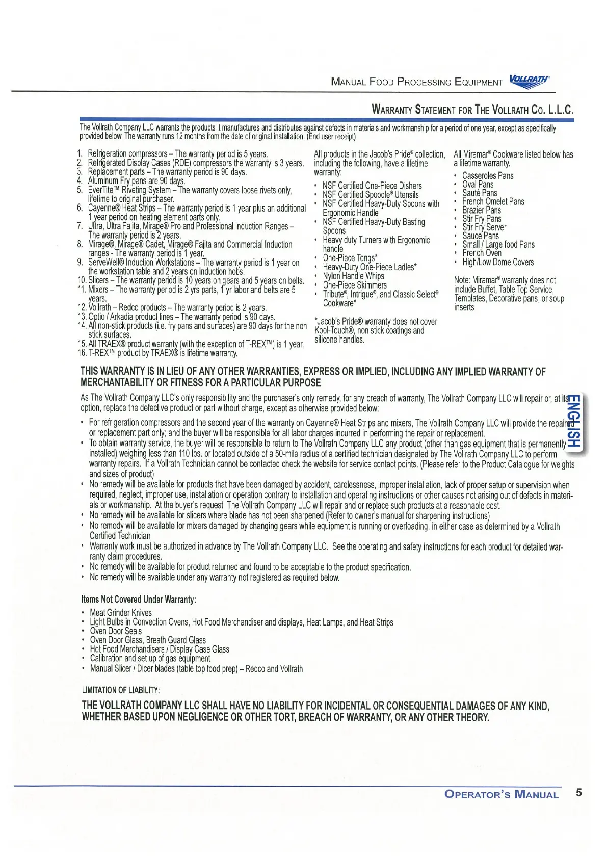 Vollrath 47713 - Warranty Statement Details; Product Warranty Coverage Overview; Warranty Exclusions and Liability Limitations