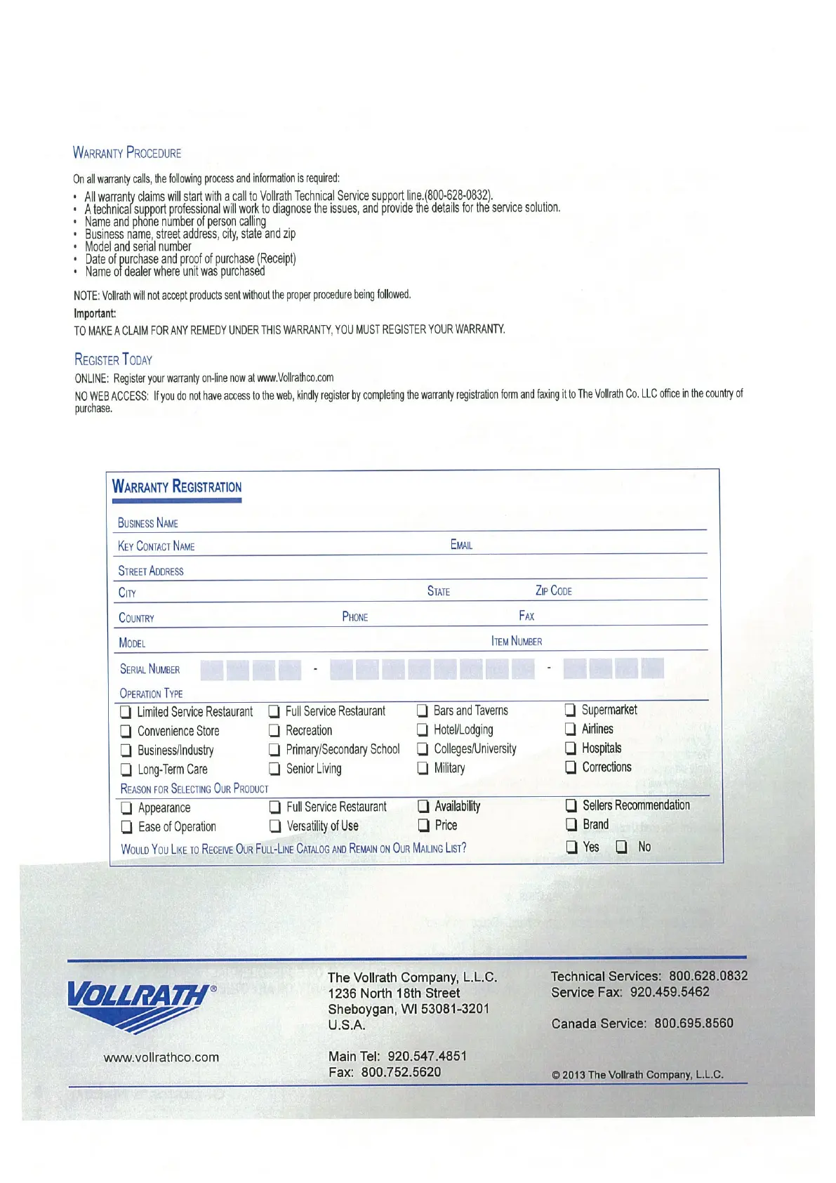Vollrath 47713 - Warranty Claim and Registration Process; Warranty Claim Procedure Steps; Product Warranty Registration Methods