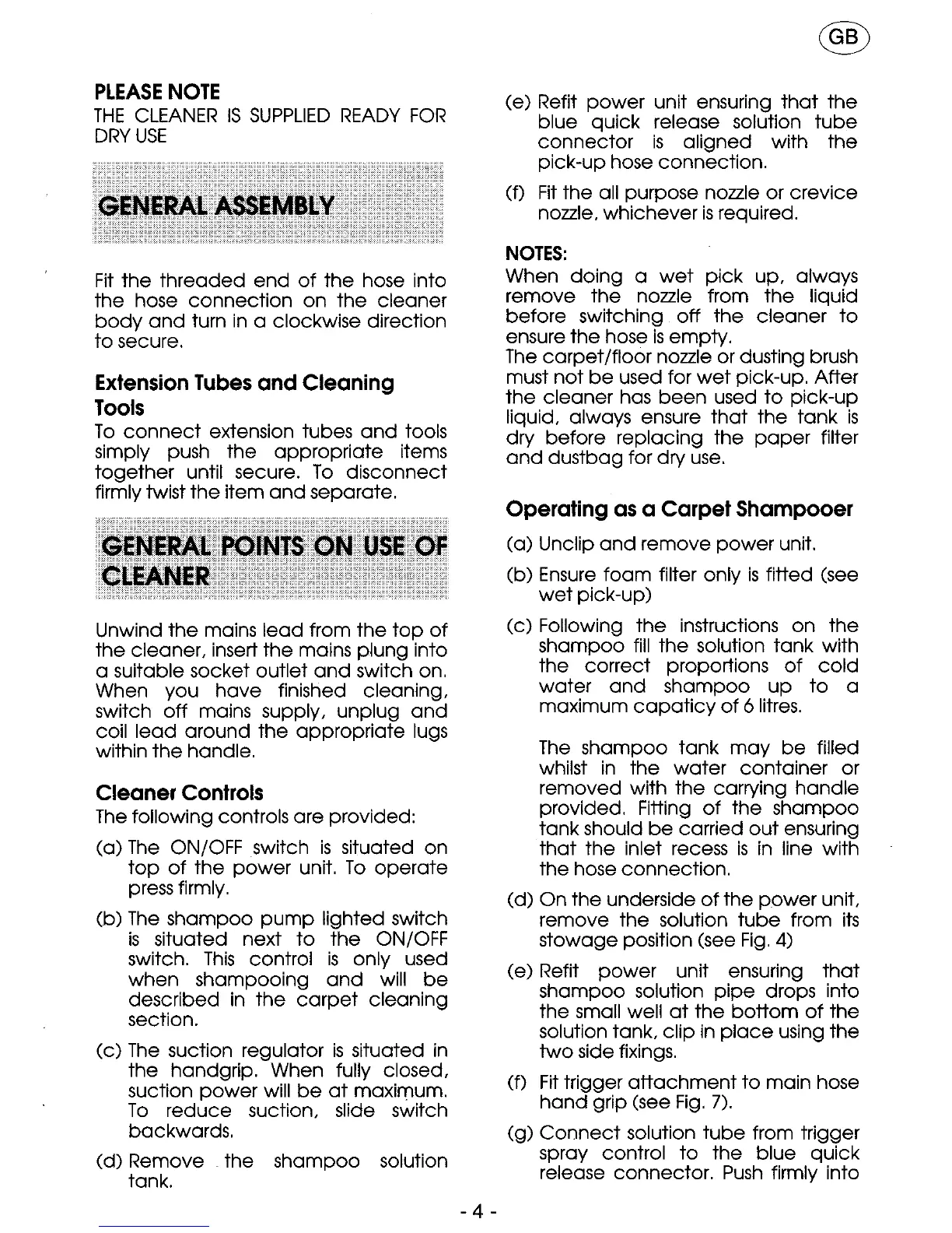 VOLTA U78 - General Assembly; General Points on Use of Cleaner; Cleaner Controls; Operating as a Carpet Shampooer