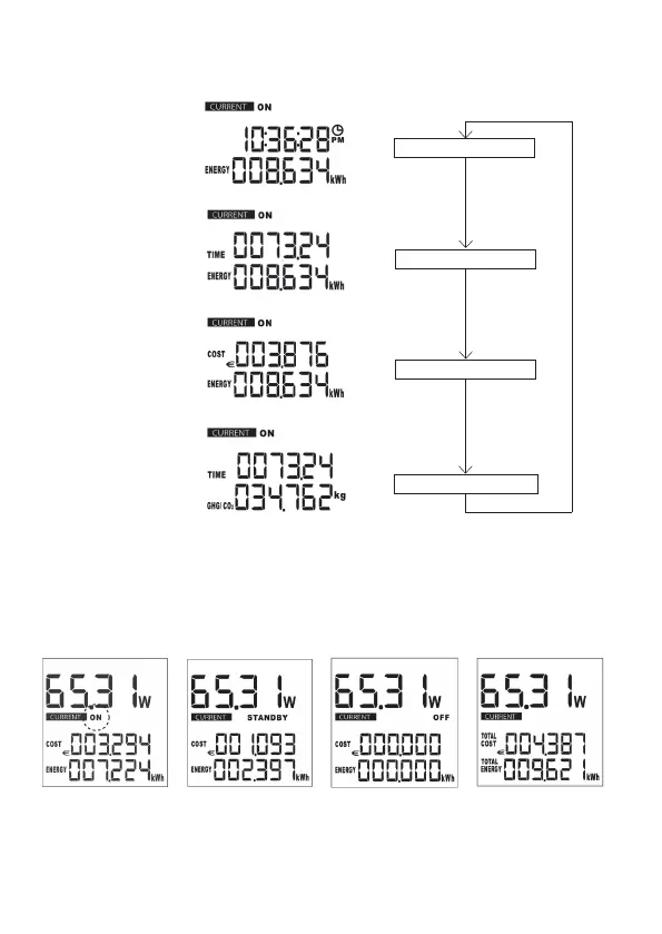 Gebruik in de stroommodus (CURRENT) de knop SET (3) om de weergavefunctie "ON",
