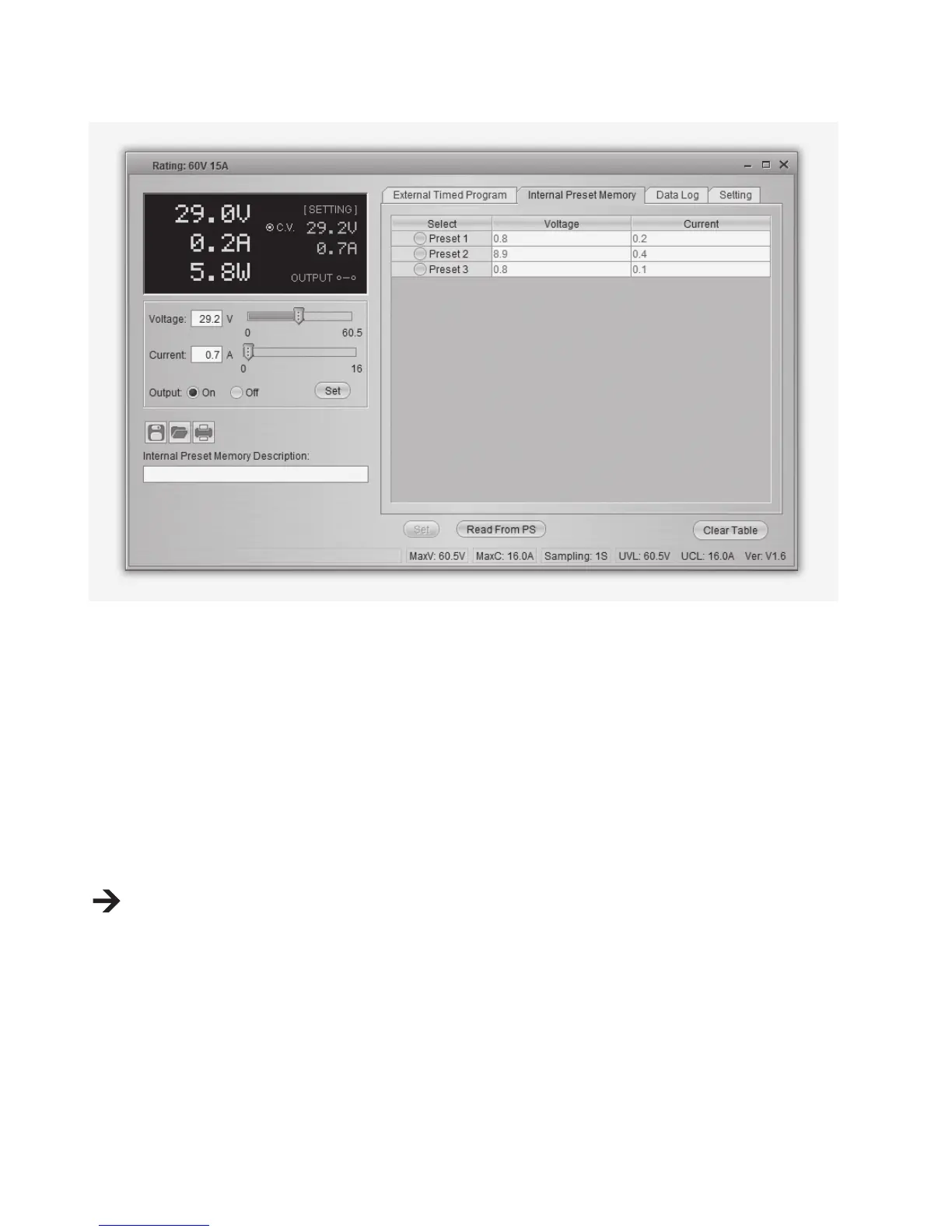 Über die Software können Sie den Voreinstellungsspeicher der Stromversorgung ablesen, einstellen