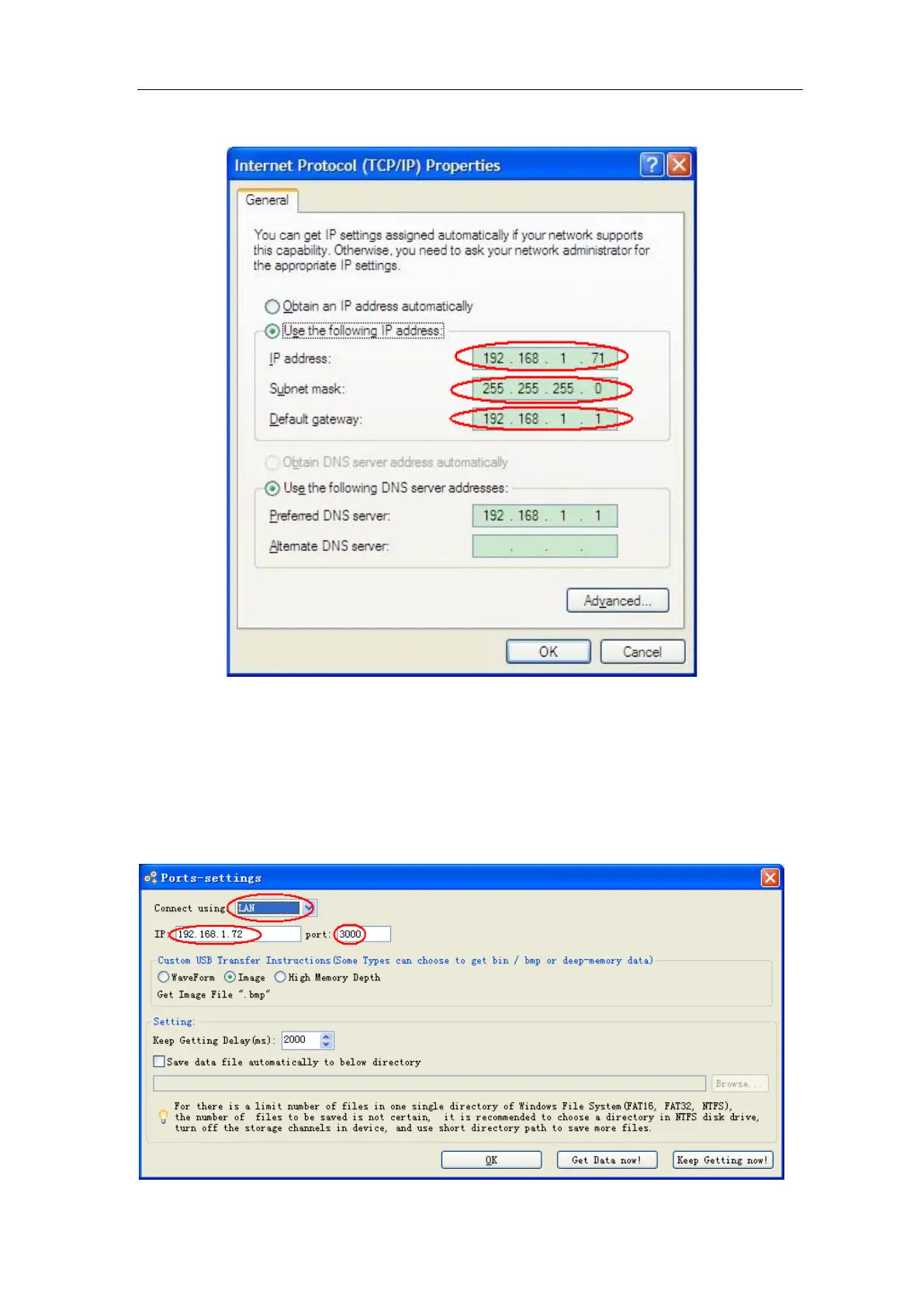 (3) Set the network parameters of the Oscilloscope Software. Run the software on the