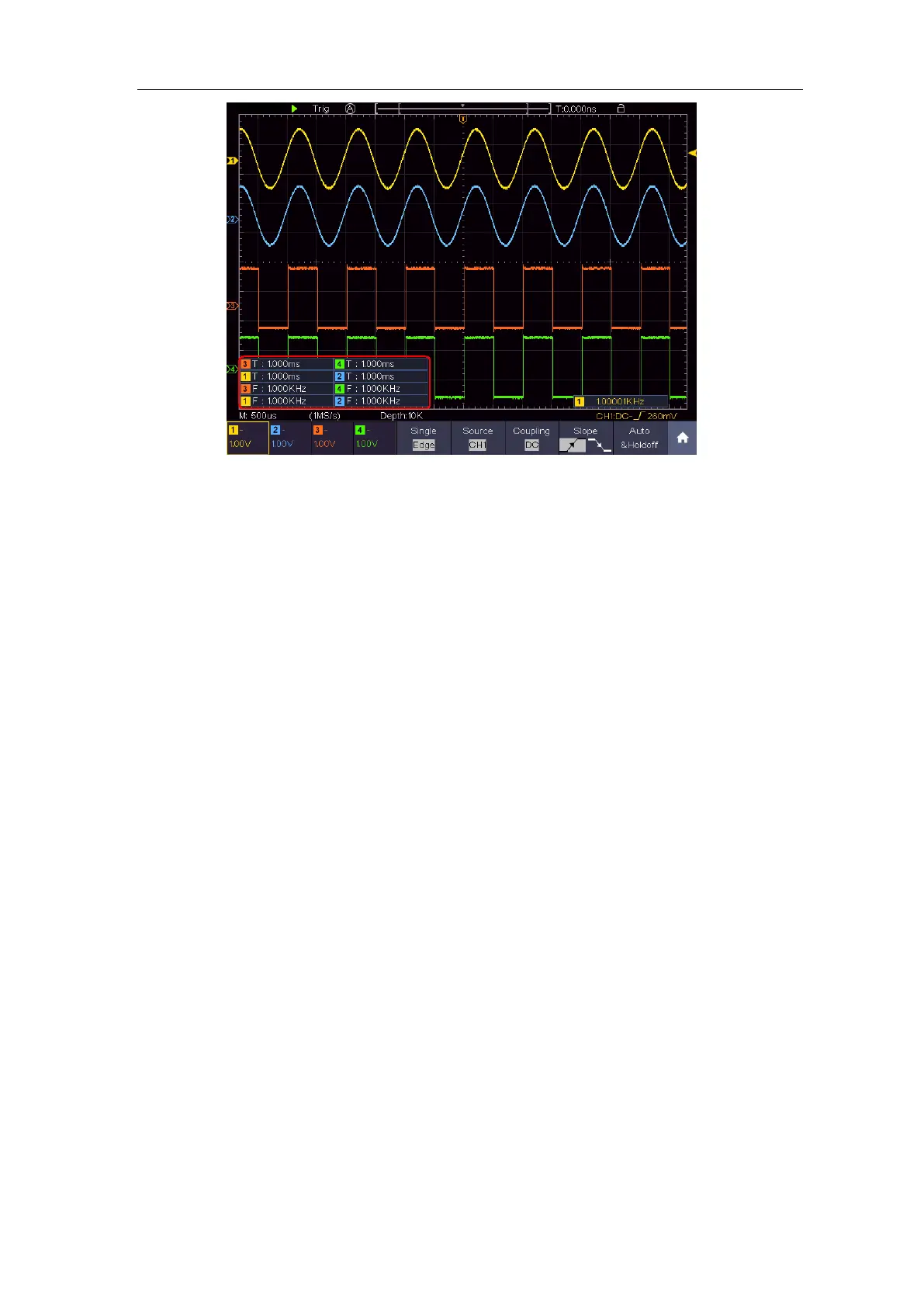 (1) Push the Autoset button and the oscilloscope will automatically adjust the
