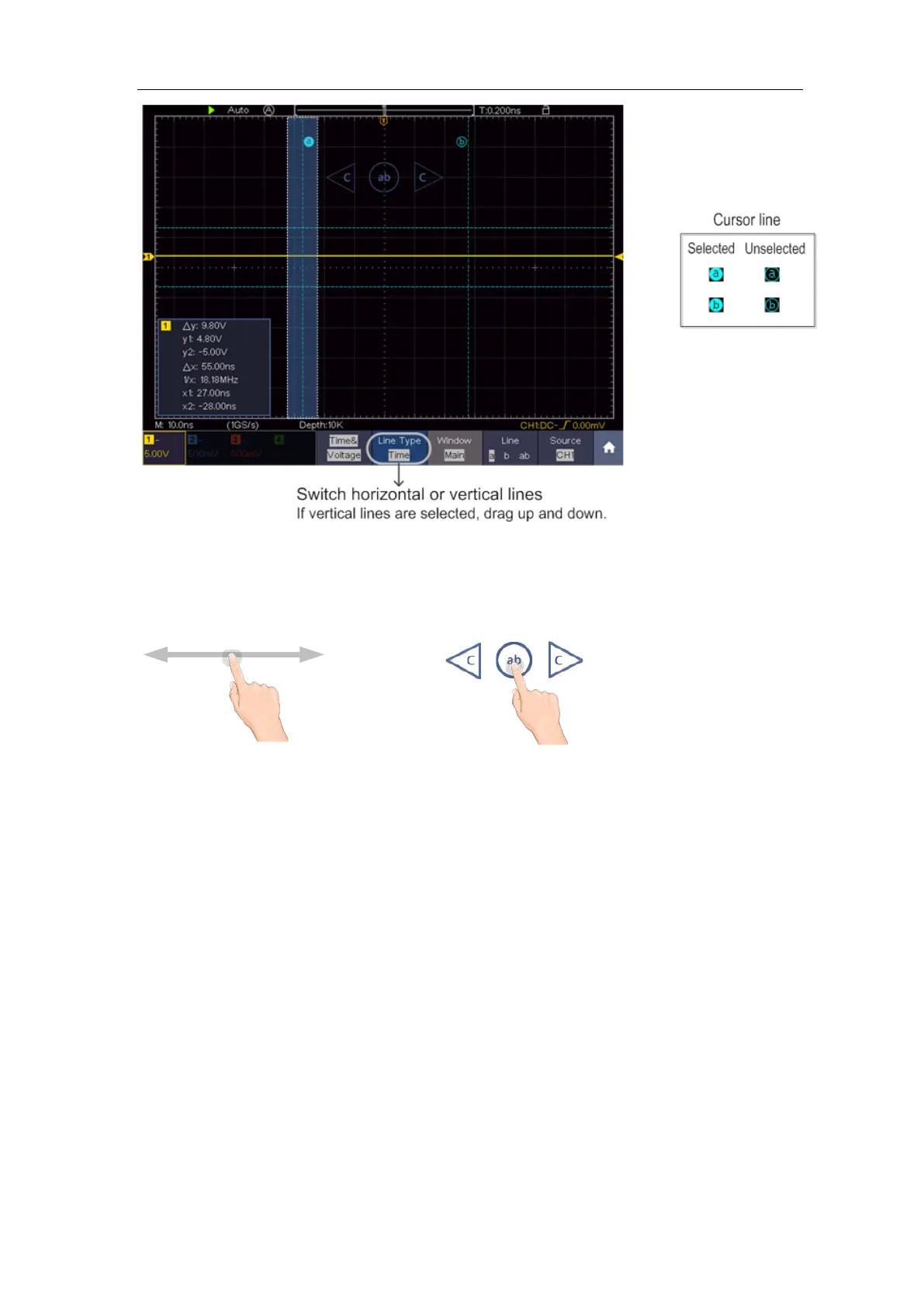 When the C icon appears, in the full screen, swipe left/right to move the selected line.