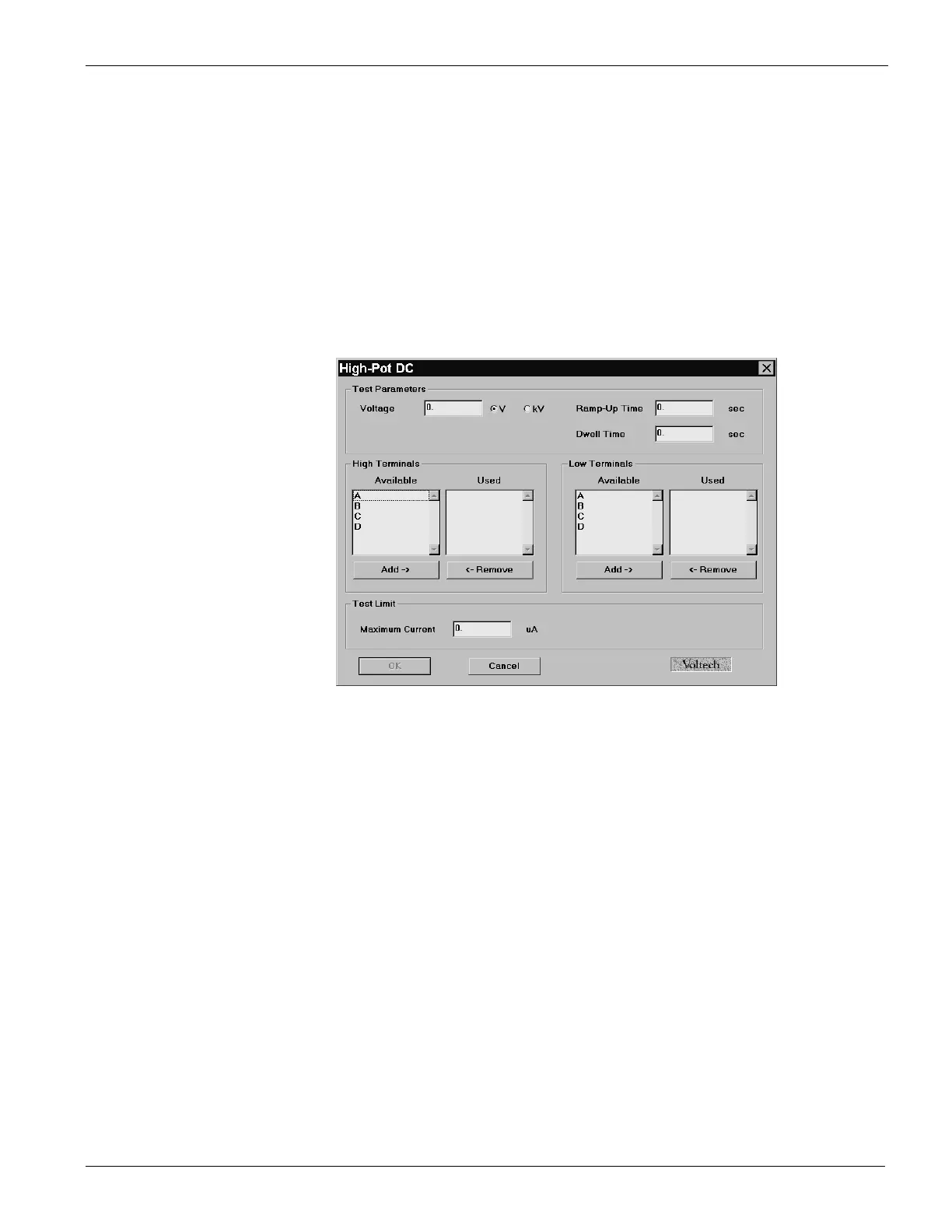On selecting ‘HPDC High-Pot dc’ from the Available Tests window, a dialogue box