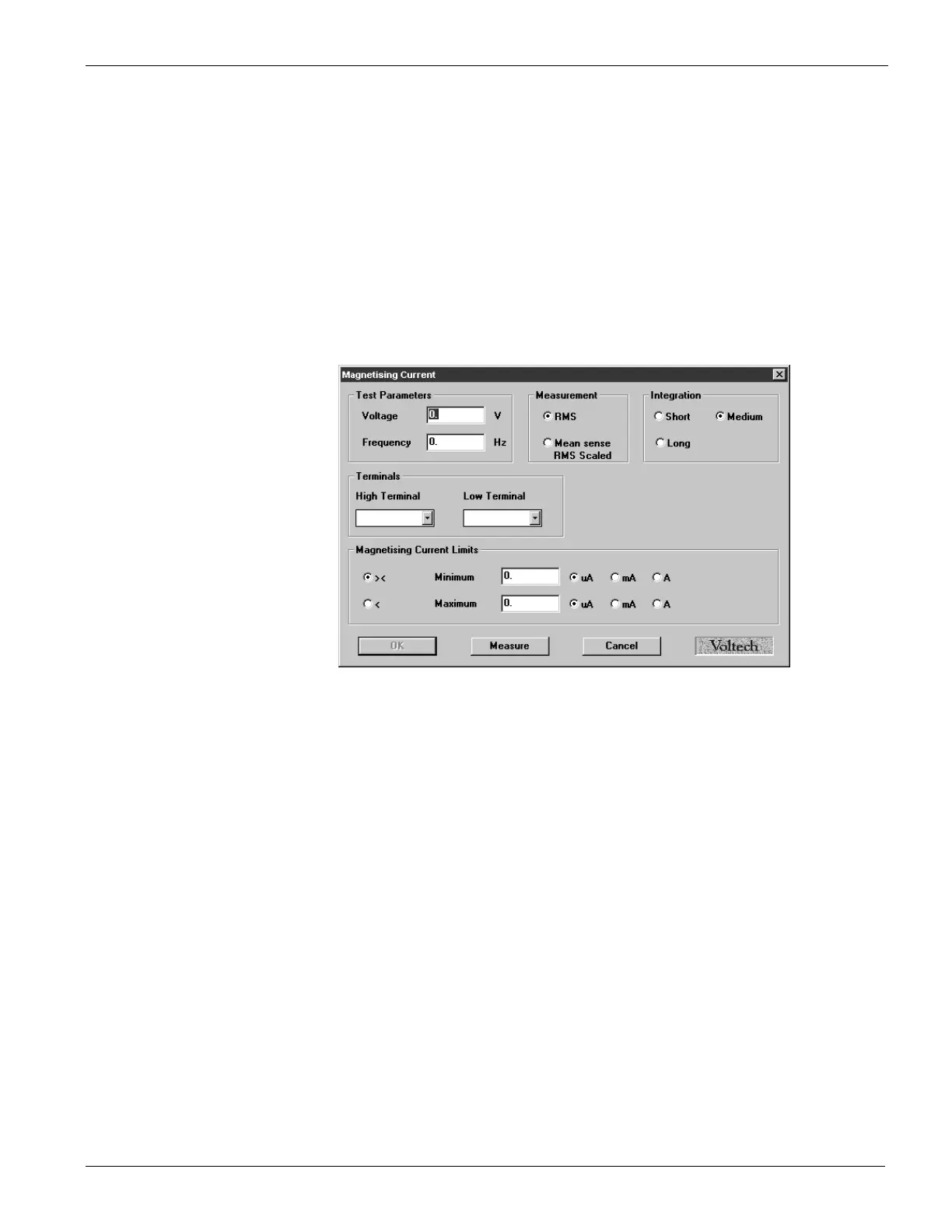 On selecting ‘MAGI Magnetizing Current’ from the available tests window, a form