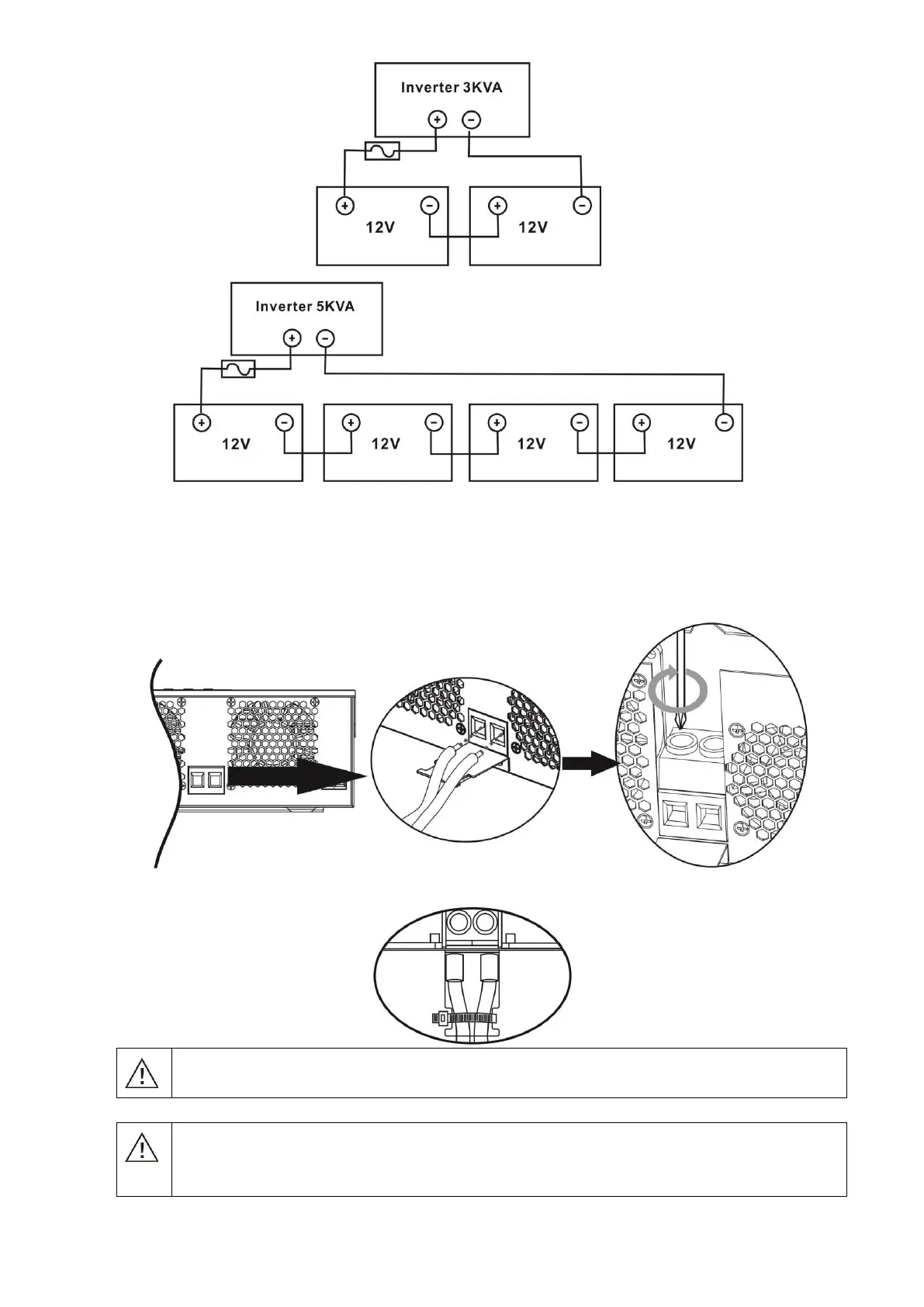 5. Insert the battery wires flatly into battery connectors of inverter and make sure the bolts are tightened with