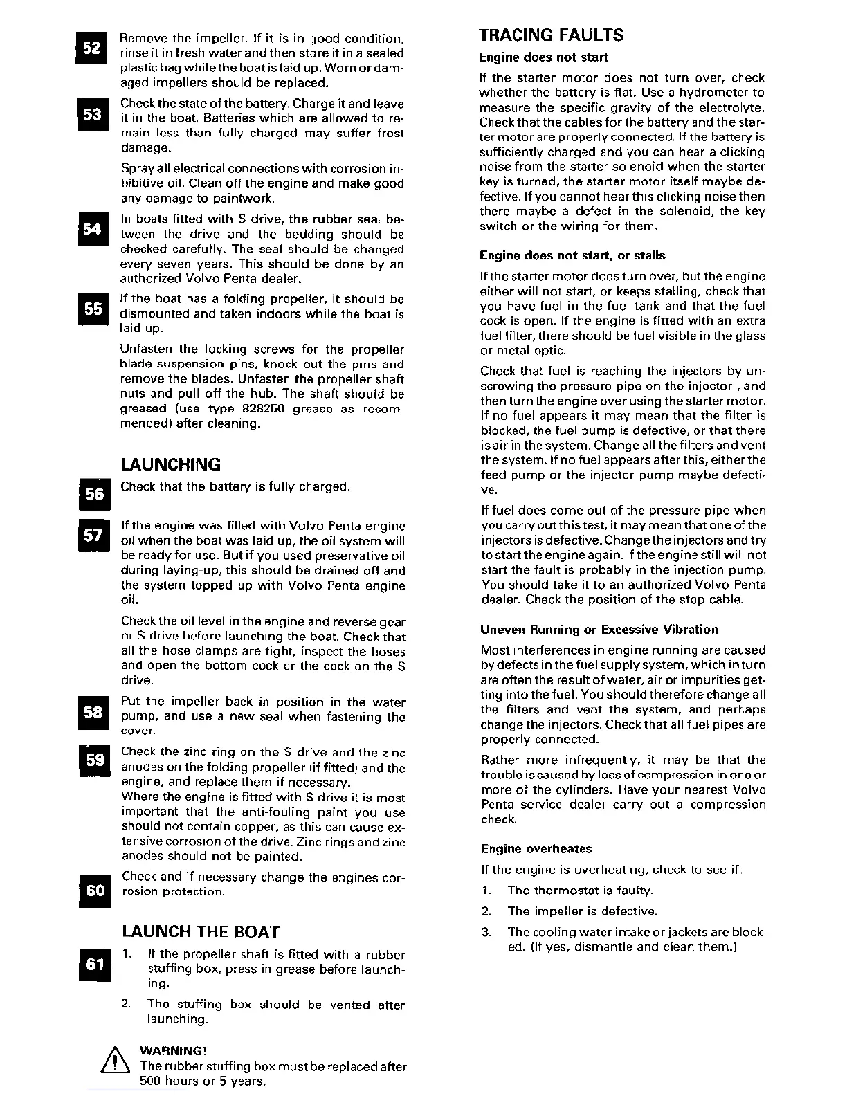 Volvo Penta 2001 - Launch the Boat; Stuffing Box Greasing; Stuffing Box Venting; Tracing Faults