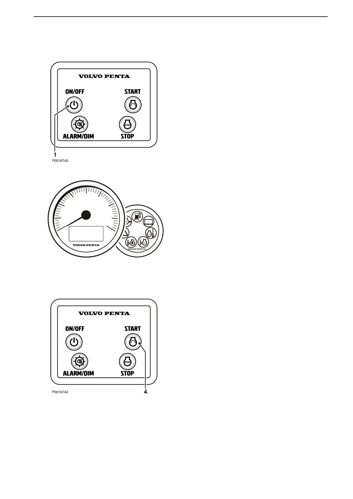 button (1). The Volvo Penta logo is displayed in the
