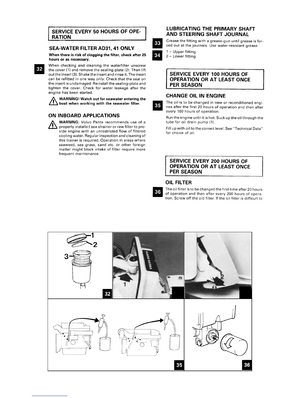 Volvo Penta MD - Service Every 50 Hours of Operation; Sea-Water Filter AD31, 41 Only; Lubricating the Primary Shaft and Steering Shaft Journal; Change Oil in Engine. Change of Oil Filter