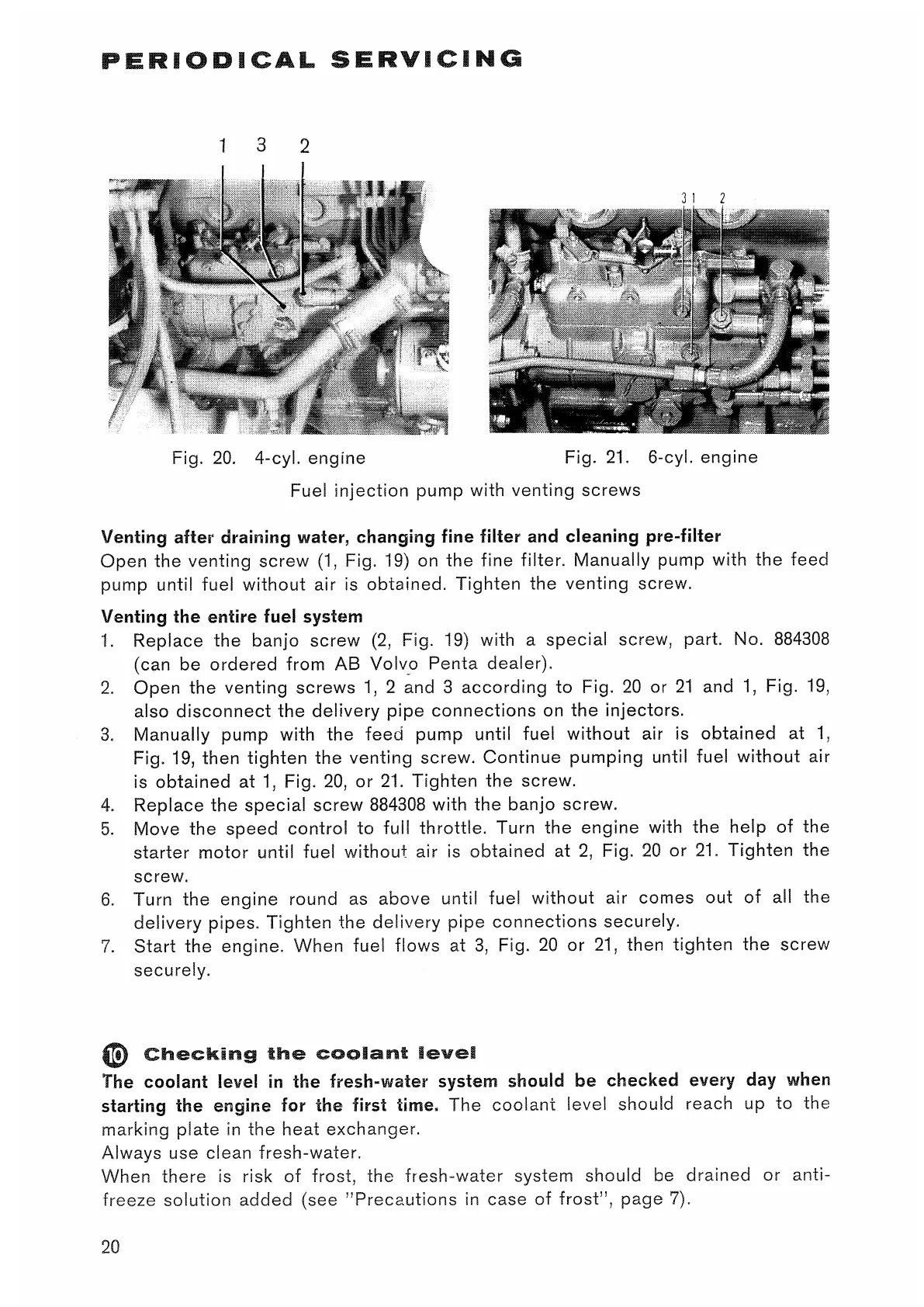 Volvo Penta MD29A - Periodical Servicing; Fuel Injection Pump with Venting Screws - Illustrations; Venting the Entire Fuel System; Checking the Coolant Level