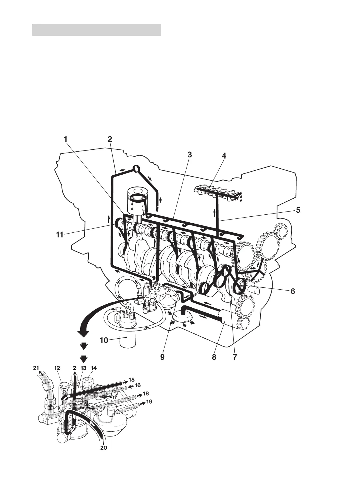 oil channels for the forced lubrication of the engine, injection pump and turbocharger. The oil also passes